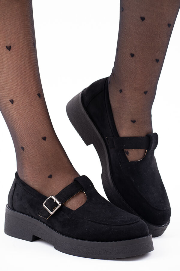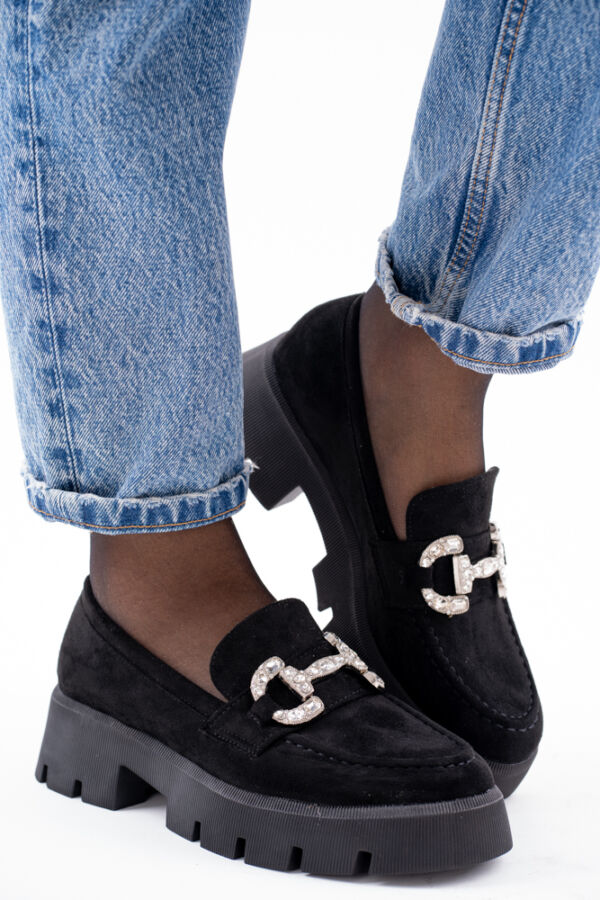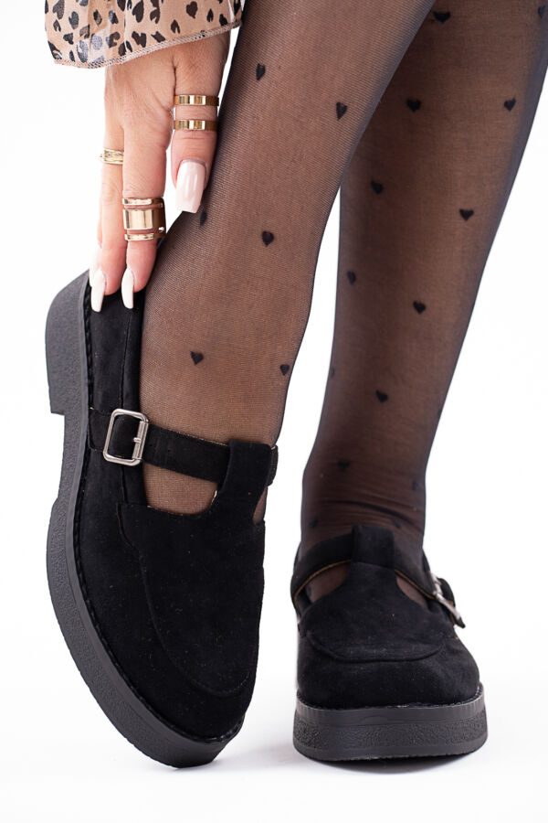 Czarne zamszowe mokasyny damskie na obcasie z klamerką