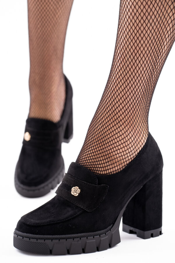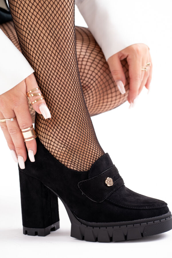Czarne mokasyny damskie na wysokim obcasie zamszowe