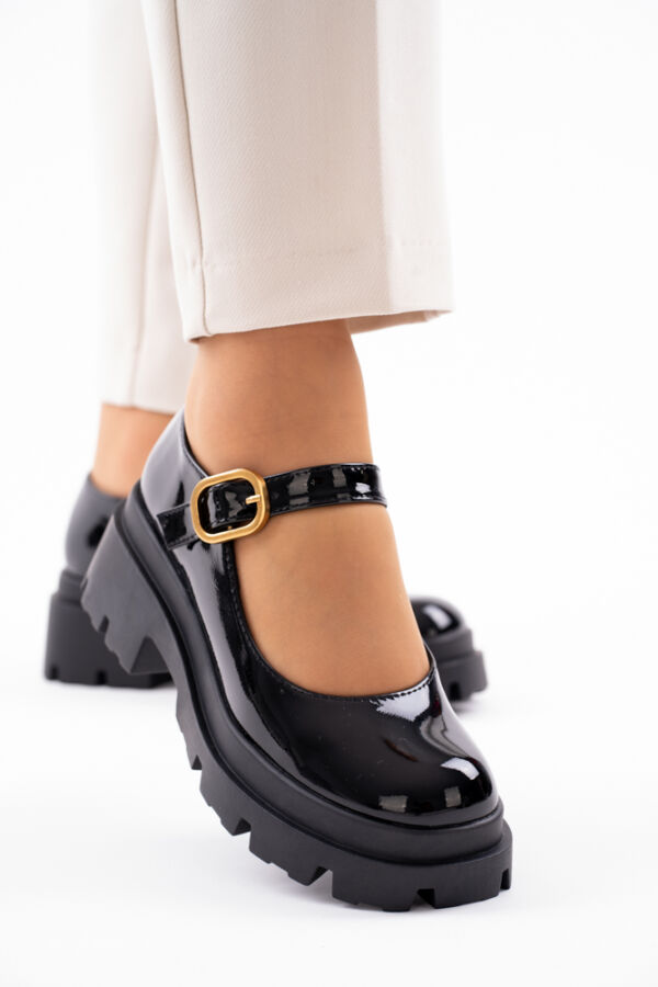 Czarne płaskie mokasyny damskie z złotą klamerką