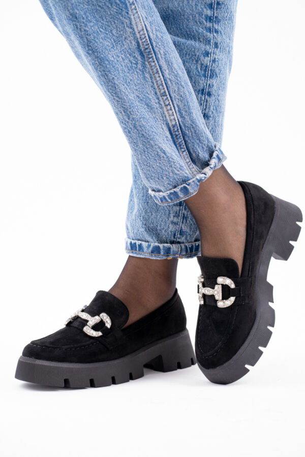 Mokasyny zamszowe czarne zdobione blaszką damskie