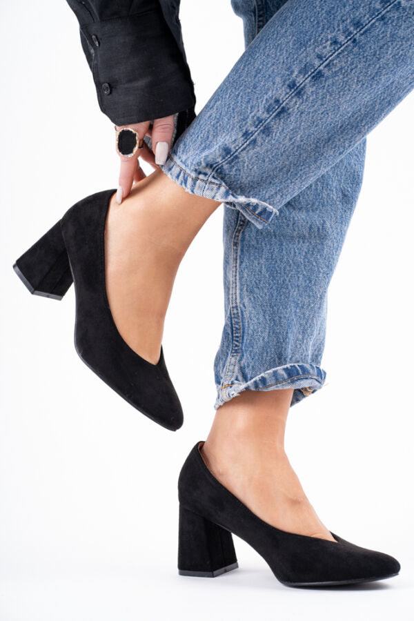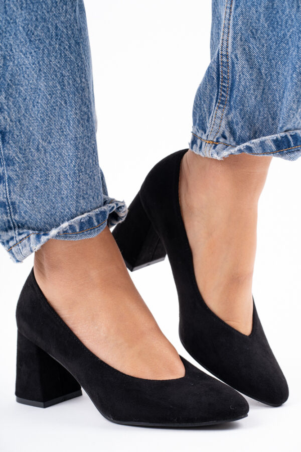 Czarne zamszowe czółenka damskie na niskim obcasie z wycięciem