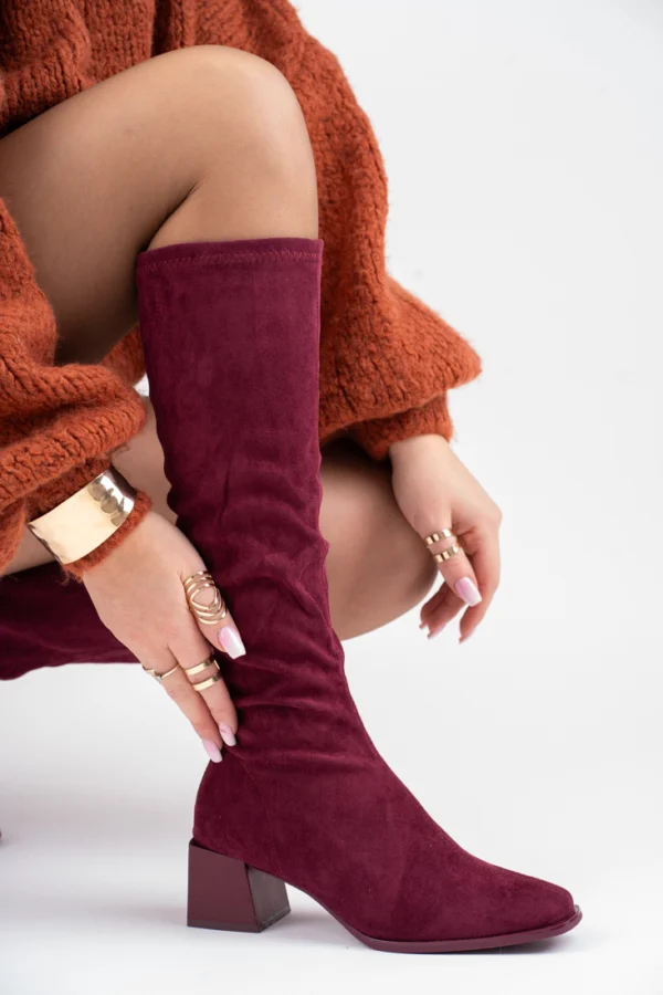 Bordowe zamszowe kozaki damskie na niskiej szpilce