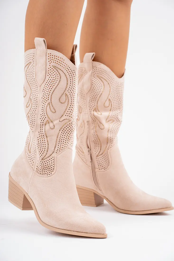 Beżowe ażurowe kowbojki damskie na niskim obcasie do kolana
