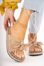 Sklep Beżowe klapki damskie z kokardą na grubym spodzie