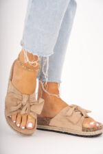 Beżowe klapki damskie z kokardą na grubym spodzie
