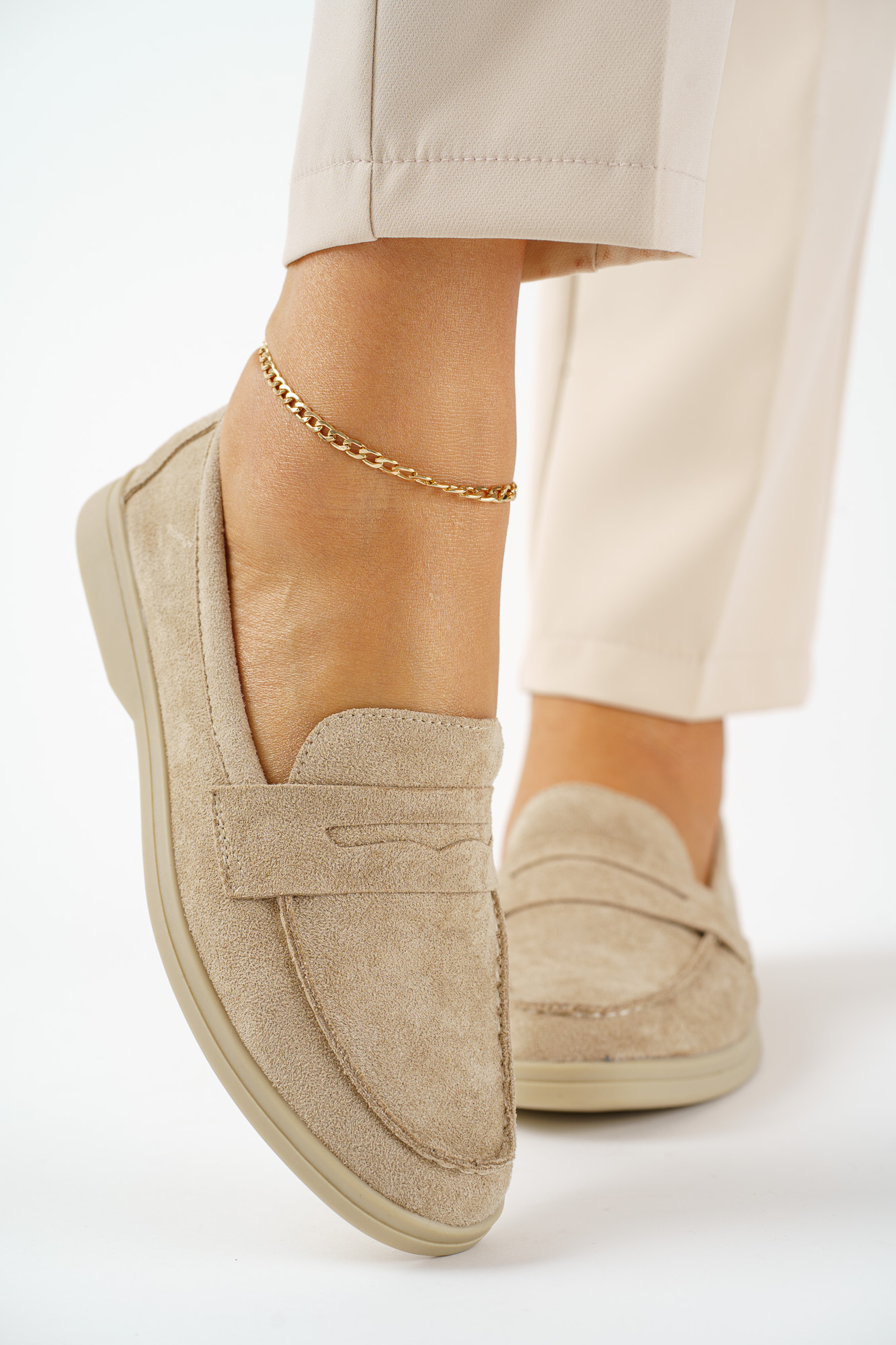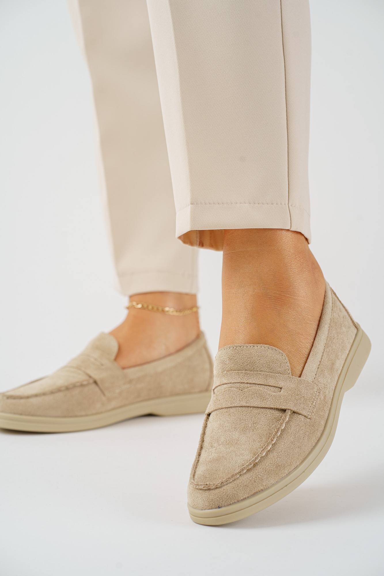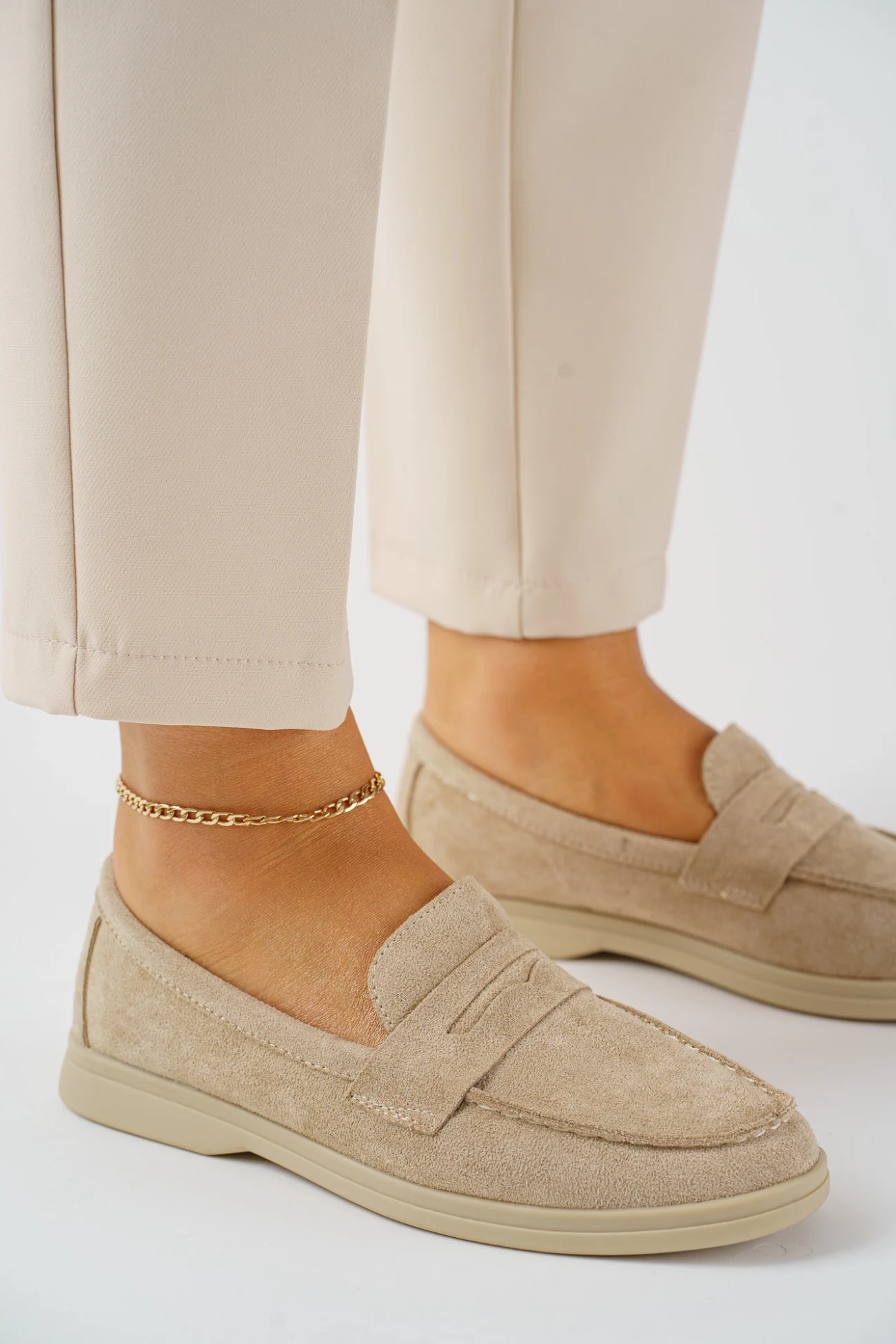 Beżowe mokasyny damskie z miękkiego zamszu – eleganckie, wygodne i ponadczasowe.