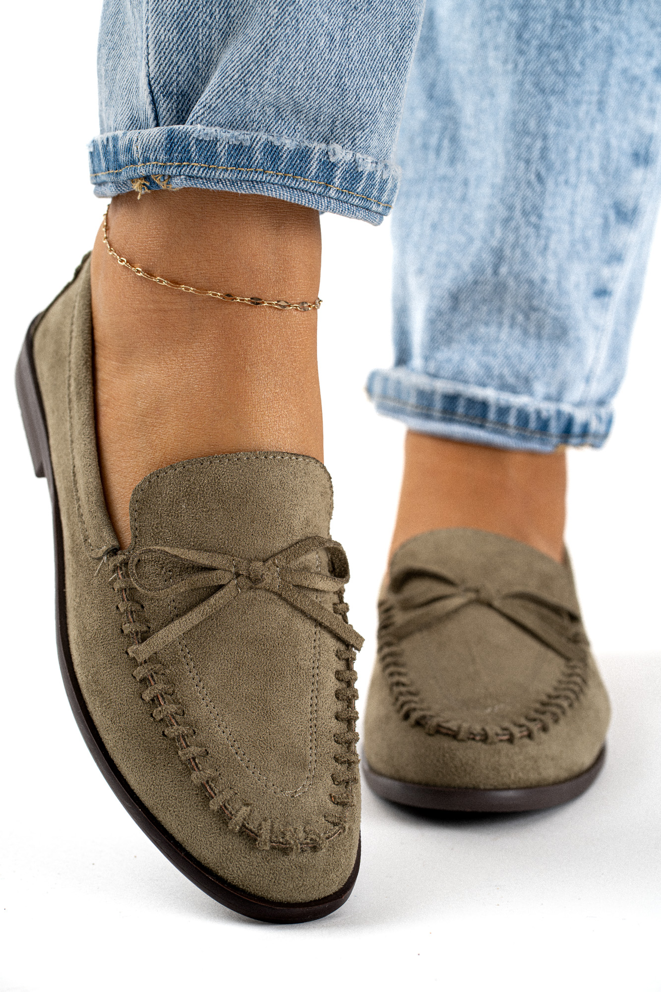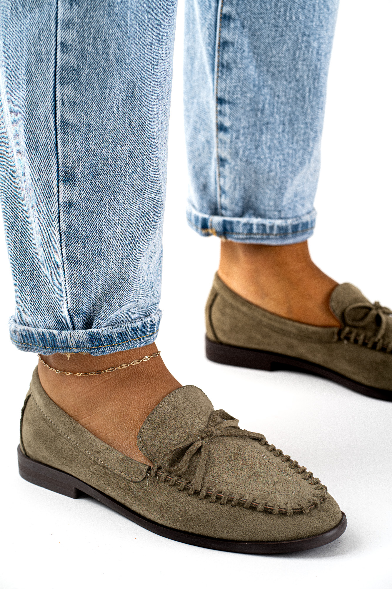 Oliwkowe mokasyny damskie zamszowe z kokardką