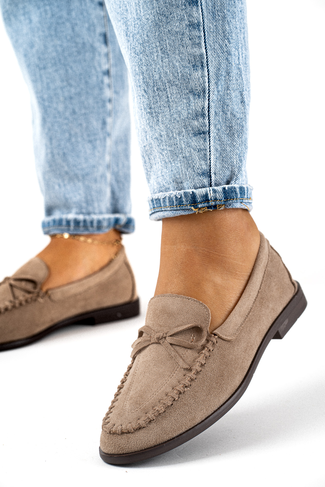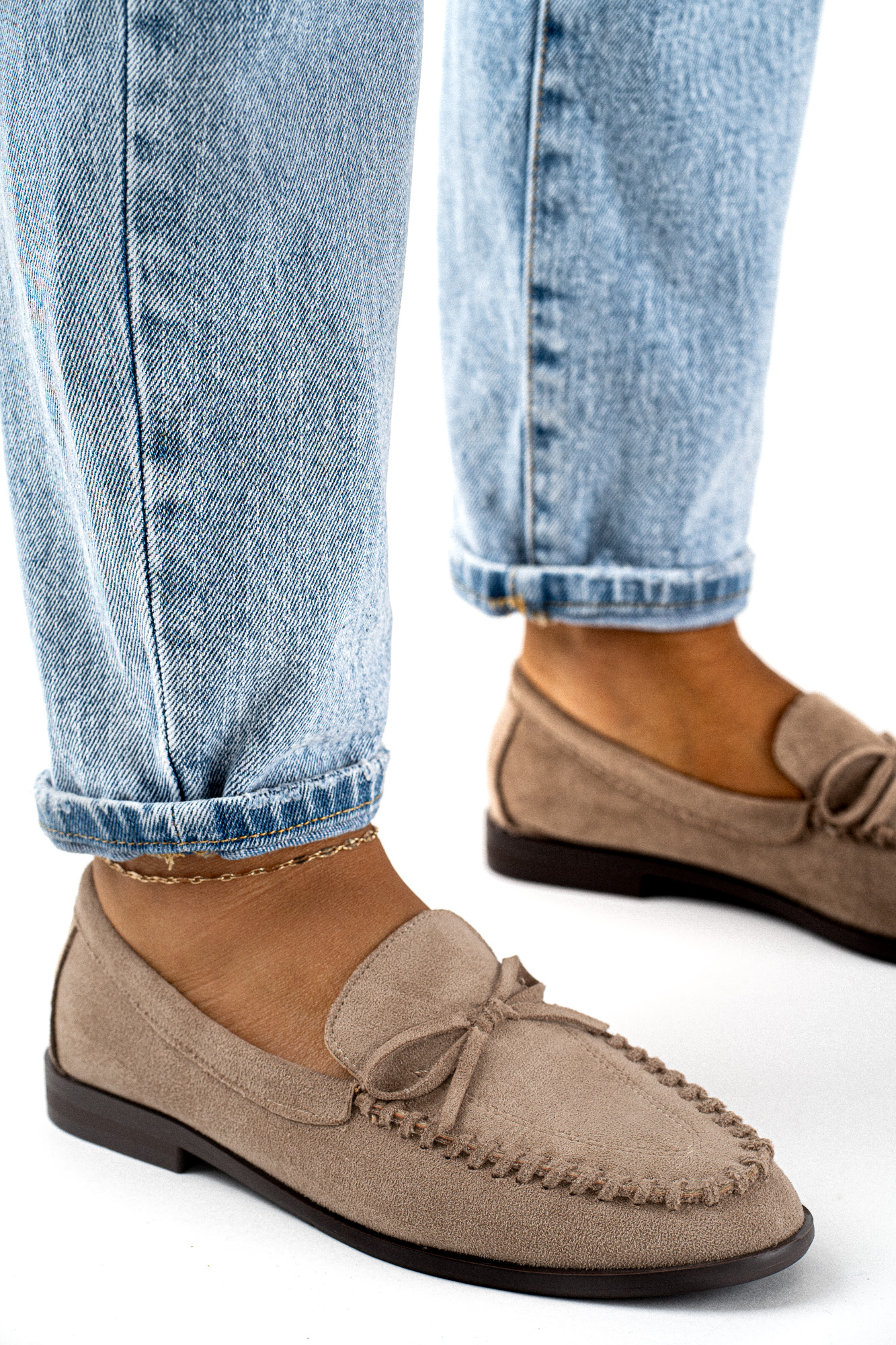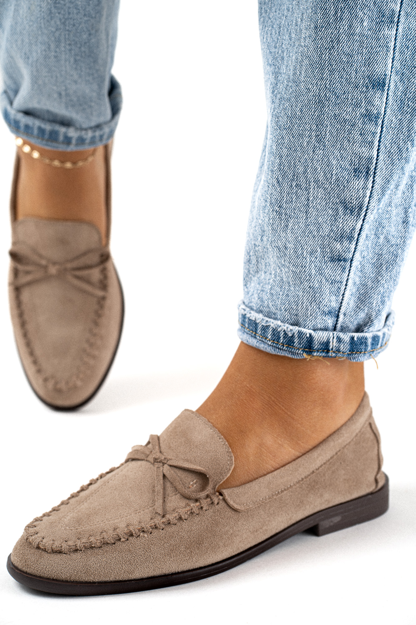 Sklep Beżowe mokasyny damskie zamszowe z kokardką