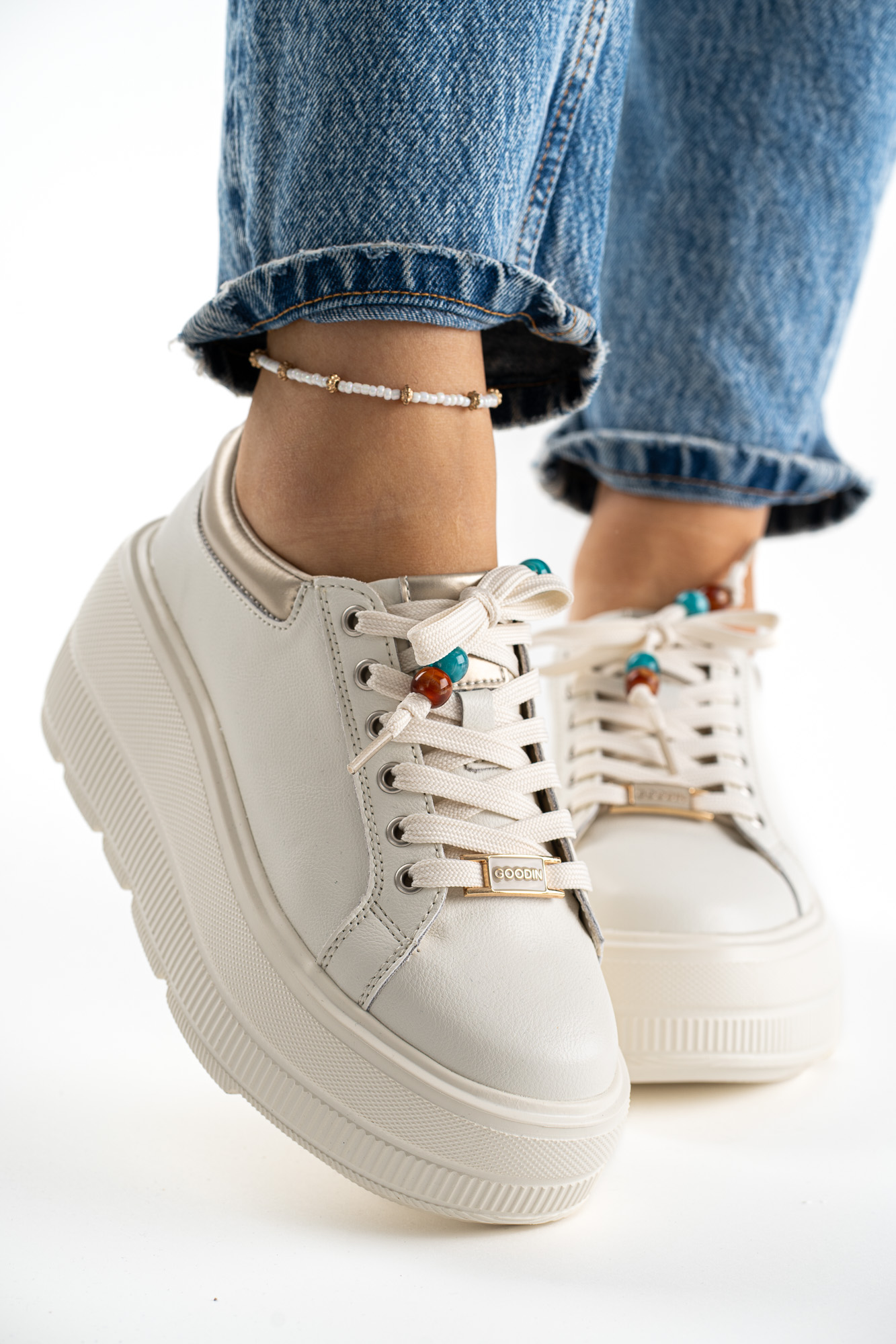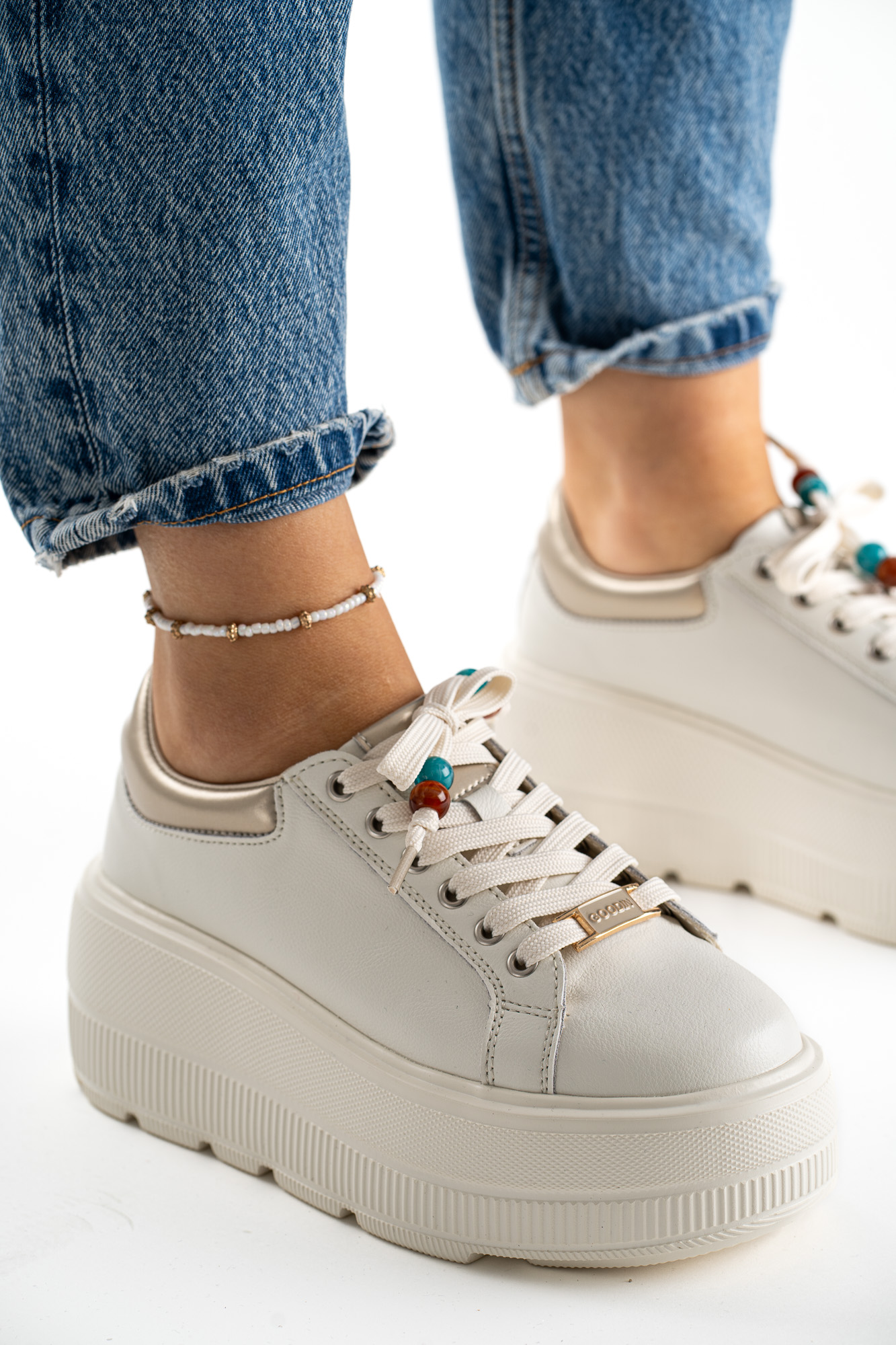 Stylowe beżowe sneakersy damskie wykonane ze skóry naturalnej, ozdobione modnymi koralikami dodającymi wyjątkowego charakteru.