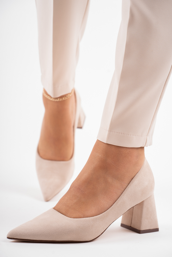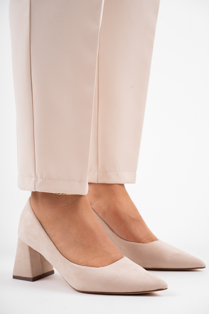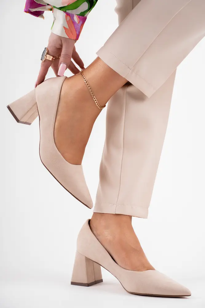 Beżowe zamszowe czółenka damskie na niskim szerokim obcasie