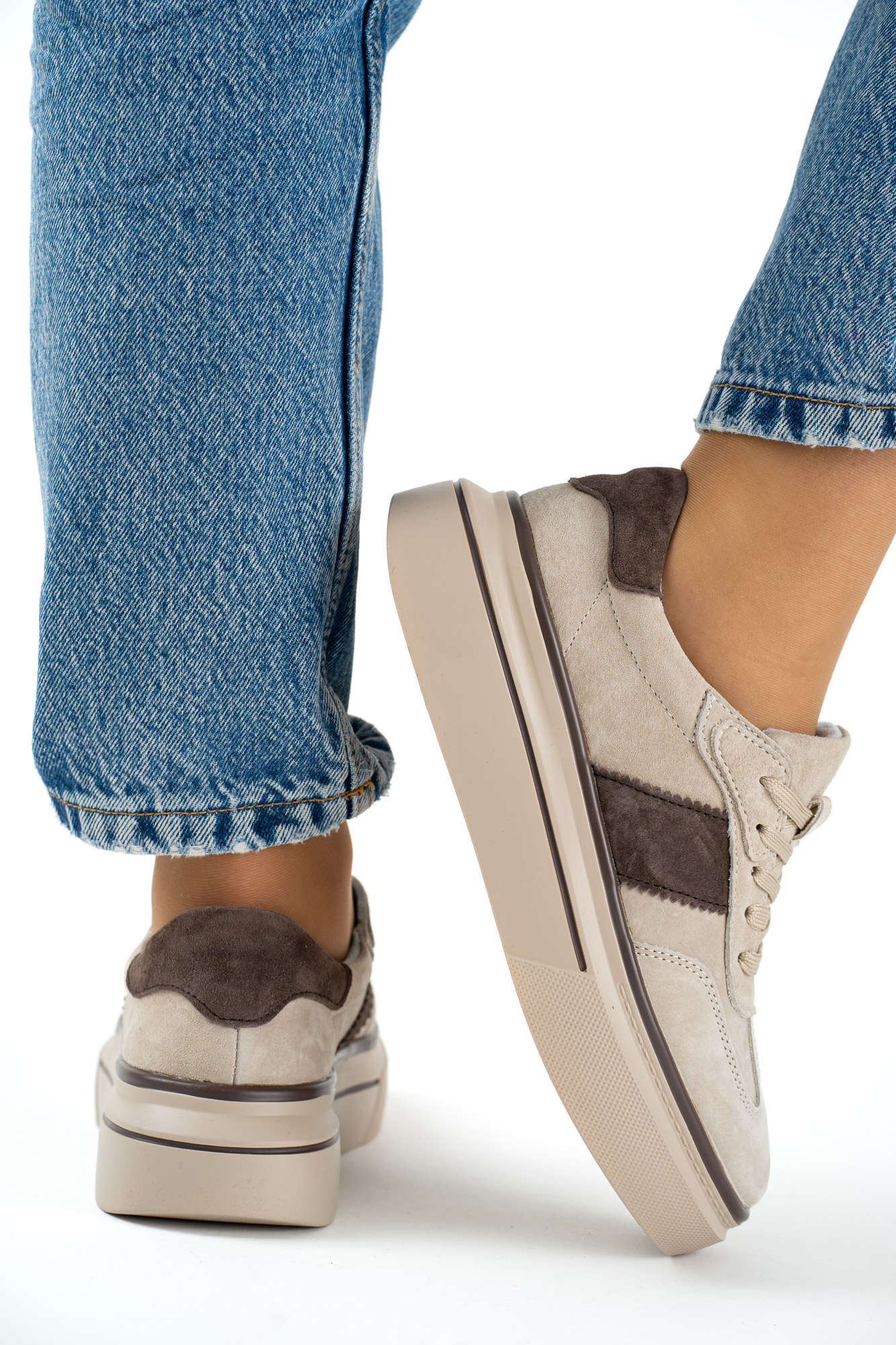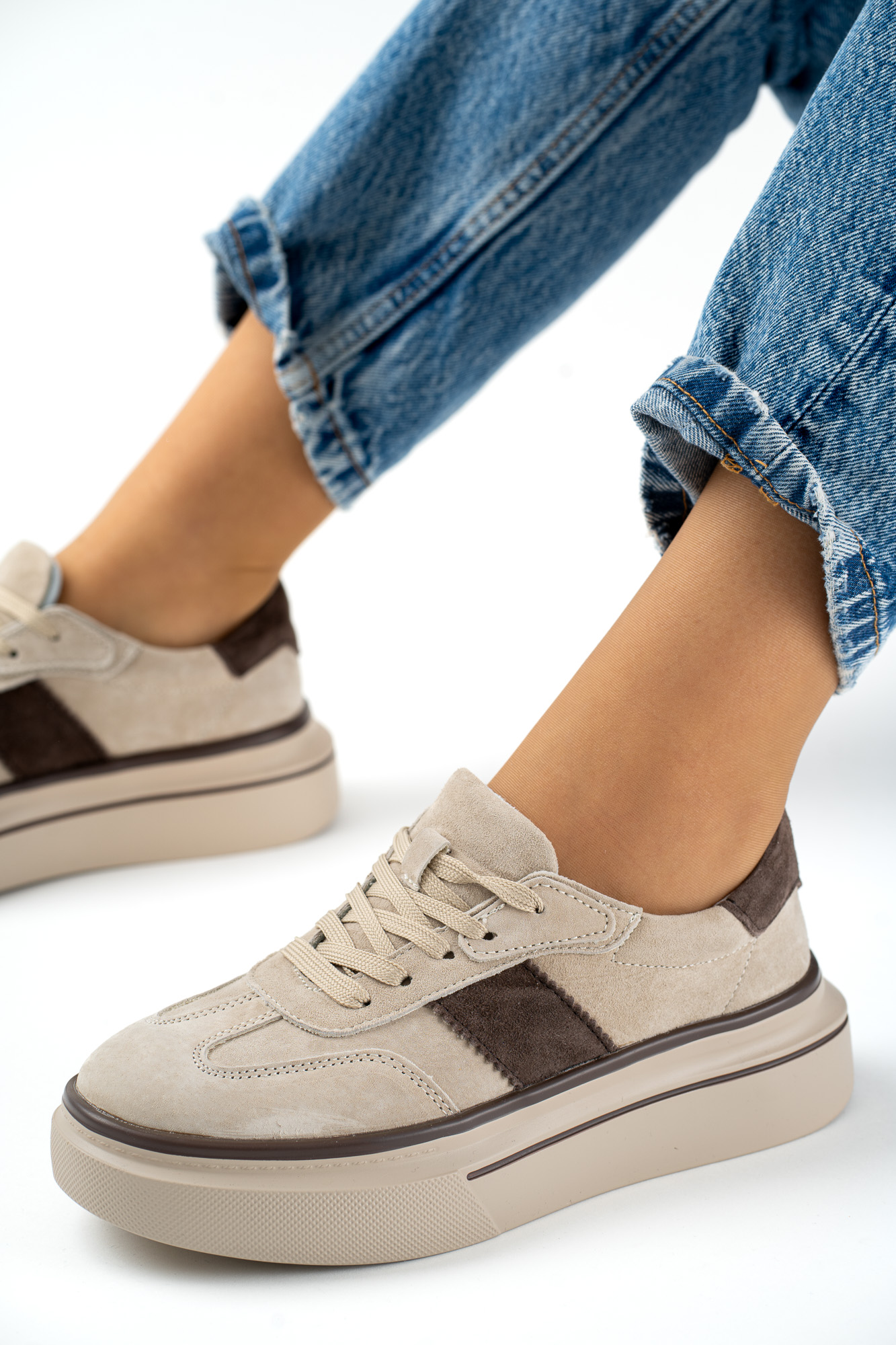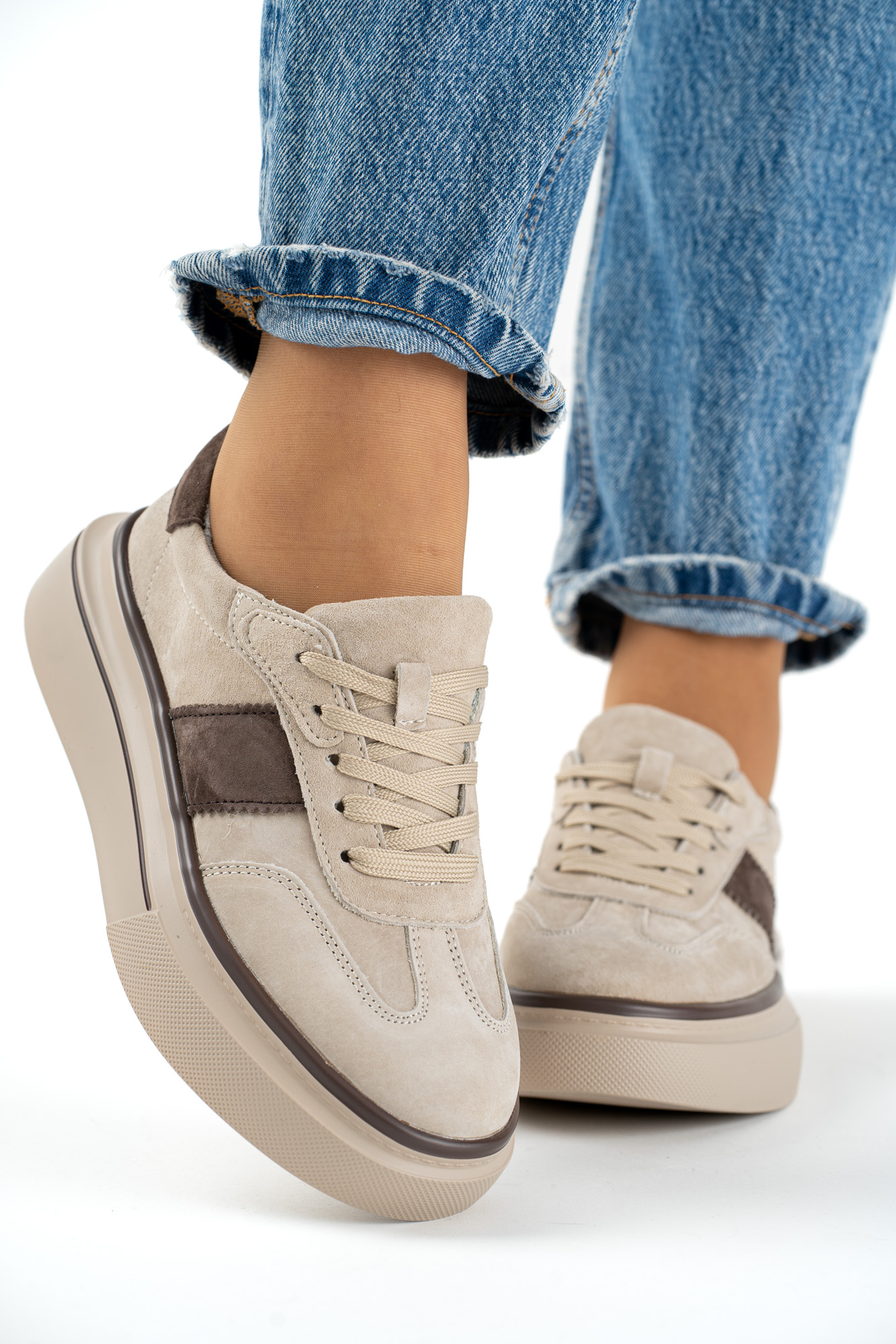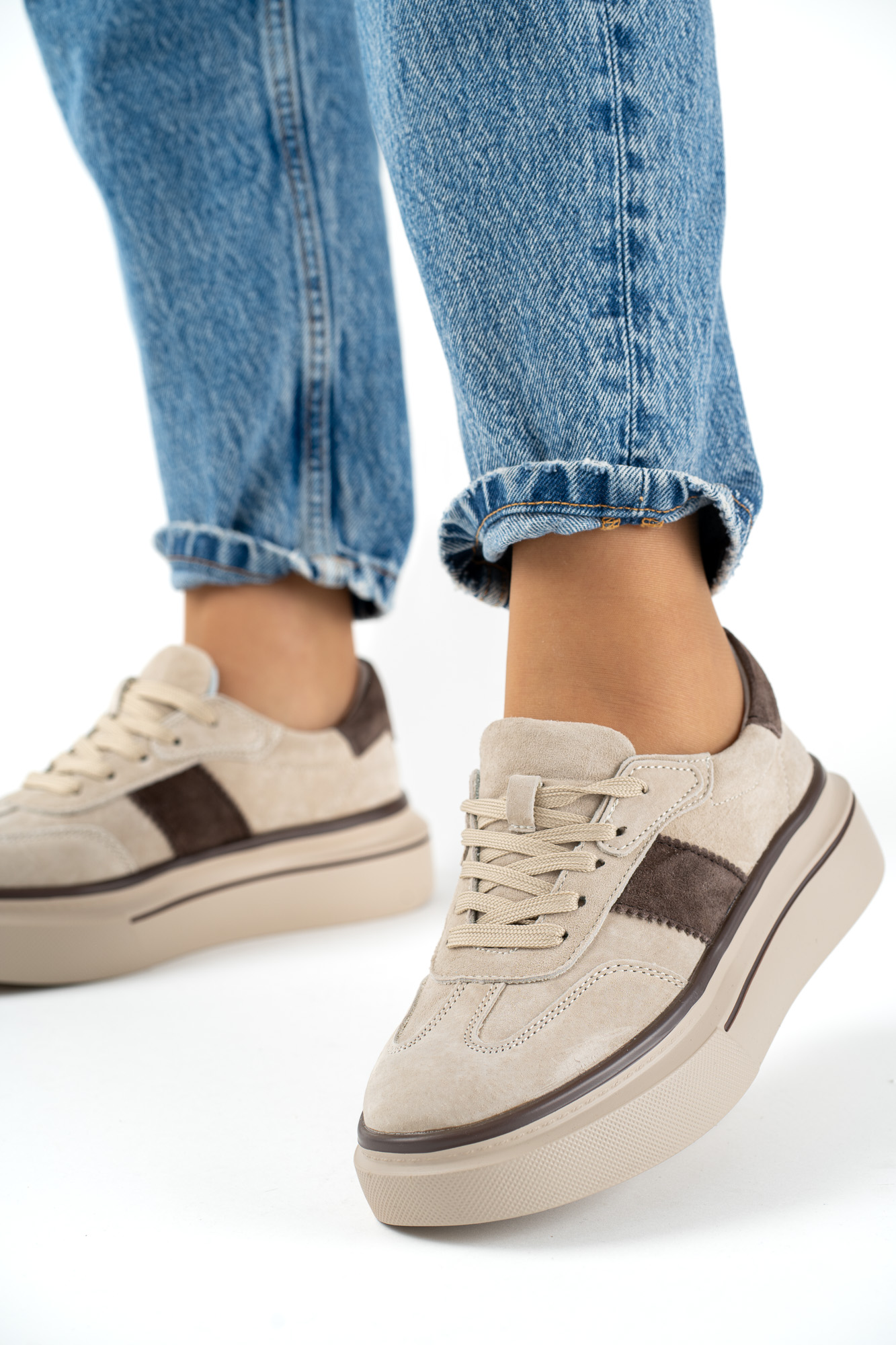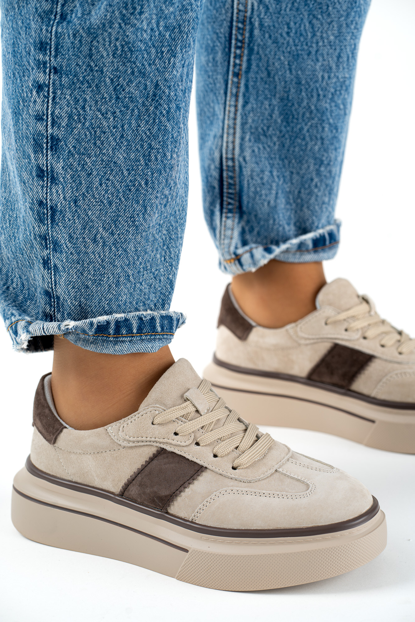 Eleganckie sneakersy damskie wykonane z wysokiej jakości skóry naturalnej w modnym beżowo-brązowym połączeniu.