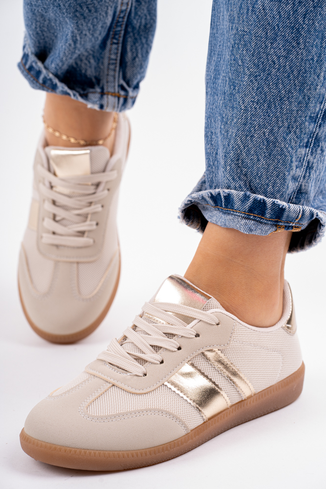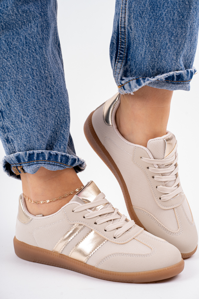 Sklep Beżowo złote trampki damskie z paskami po boku