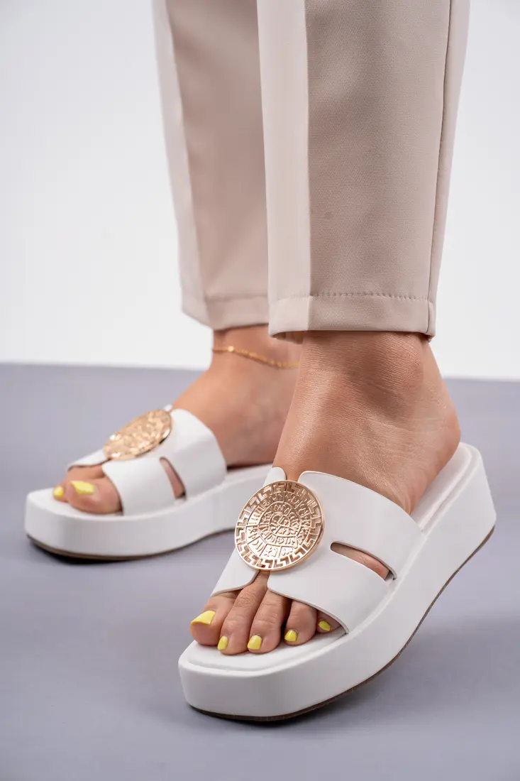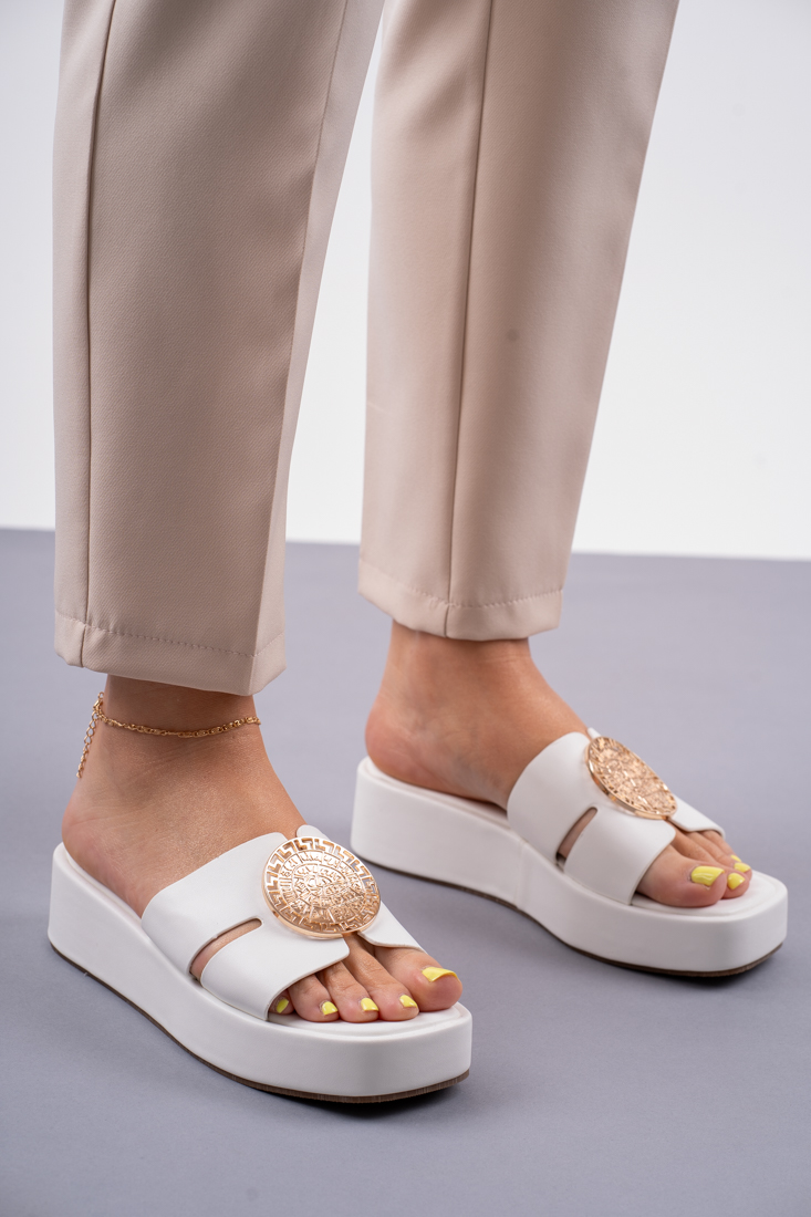 Sklep Białe klapki damskie na platformie z złotym emblematem