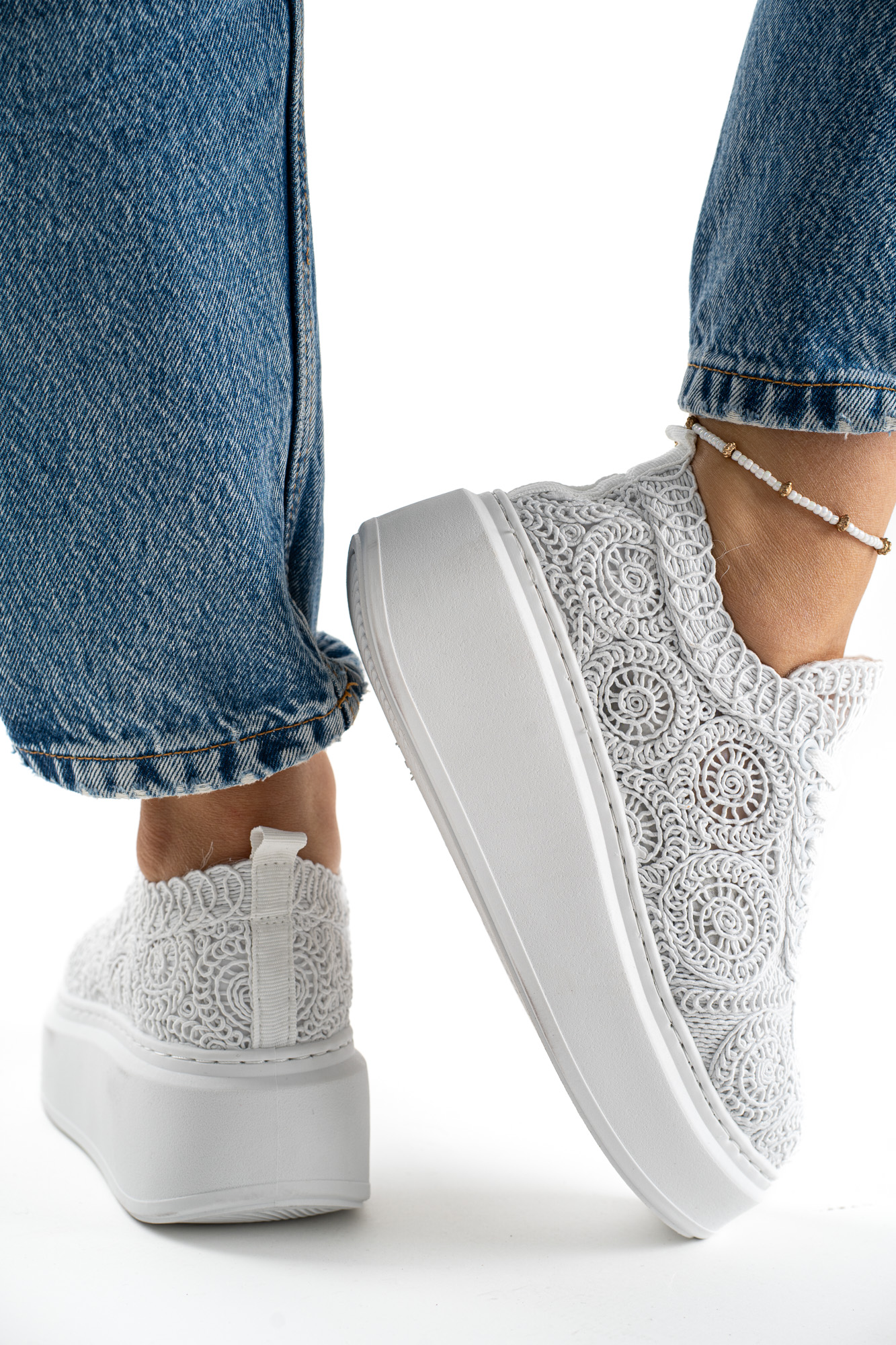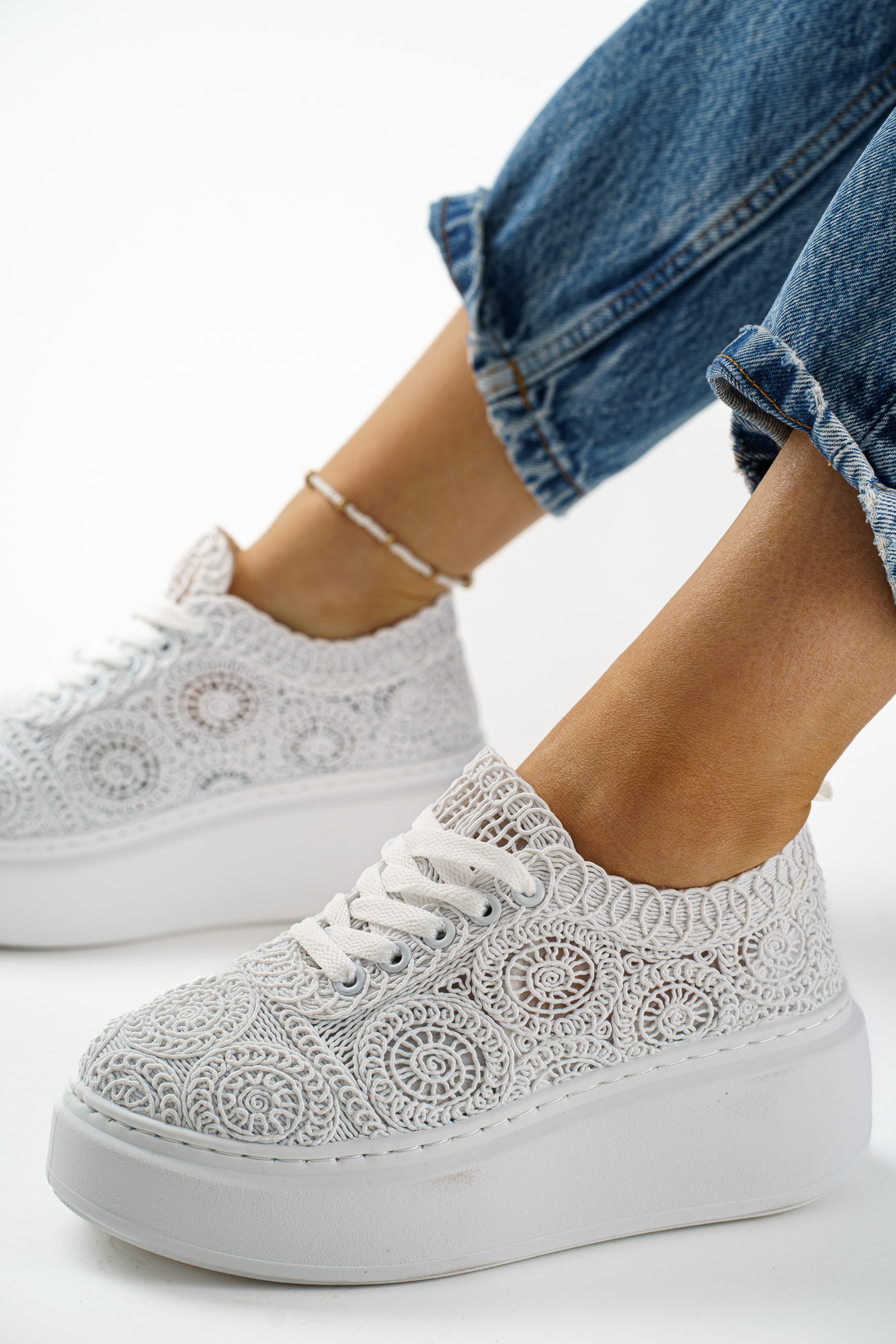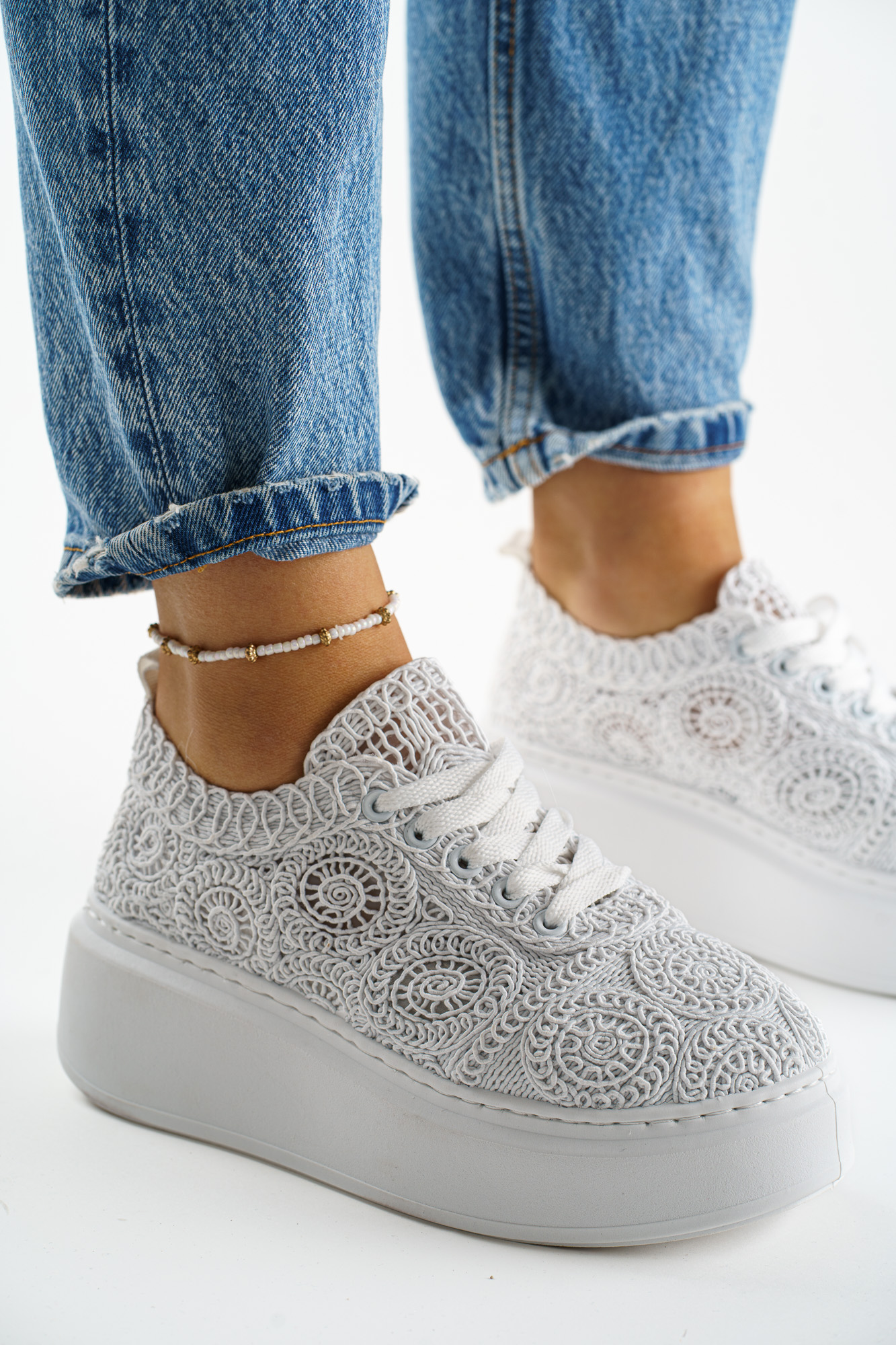 Stylowe białe sneakersy damskie na platformie z efektowną koronkową cholewką.