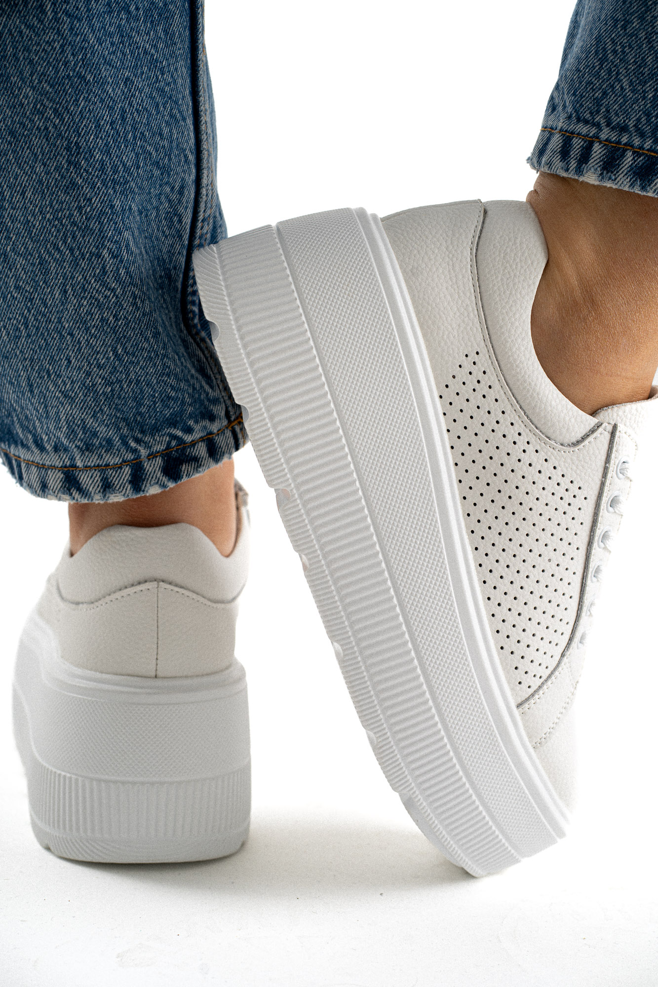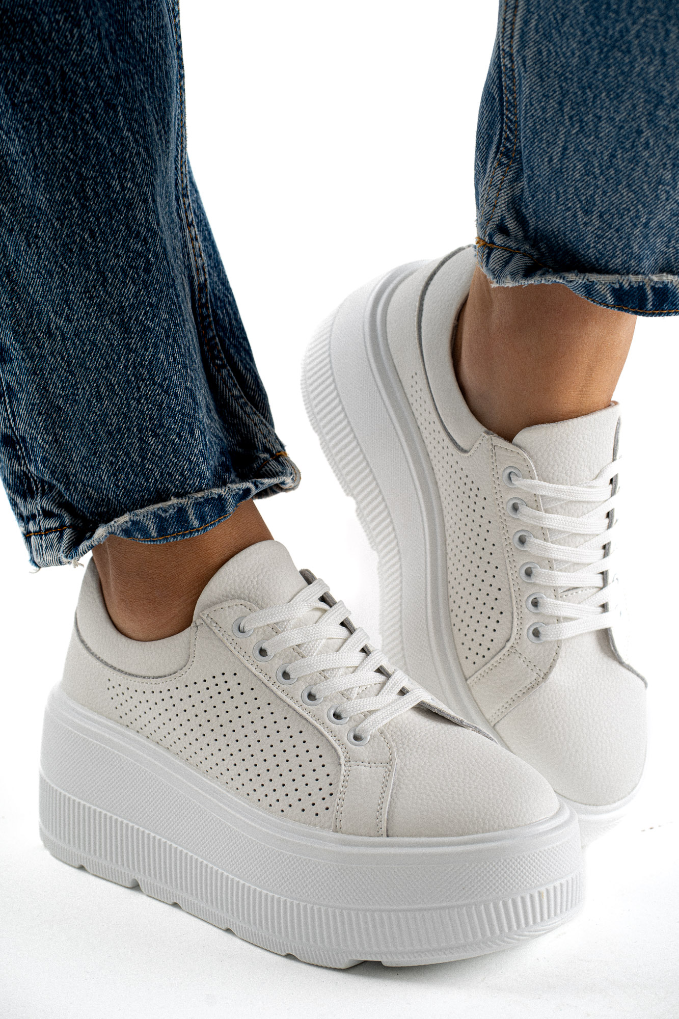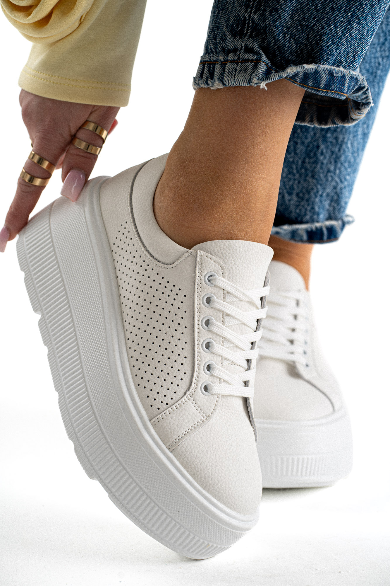 Białe sneakersy damskie skórzane na platformie o nowoczesnym, sportowym designie.