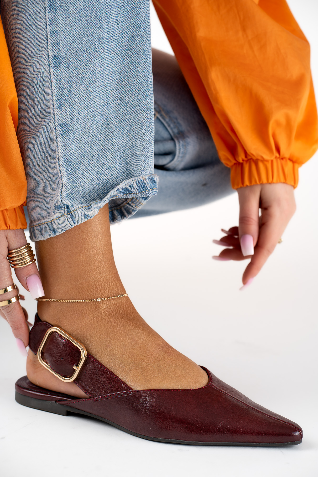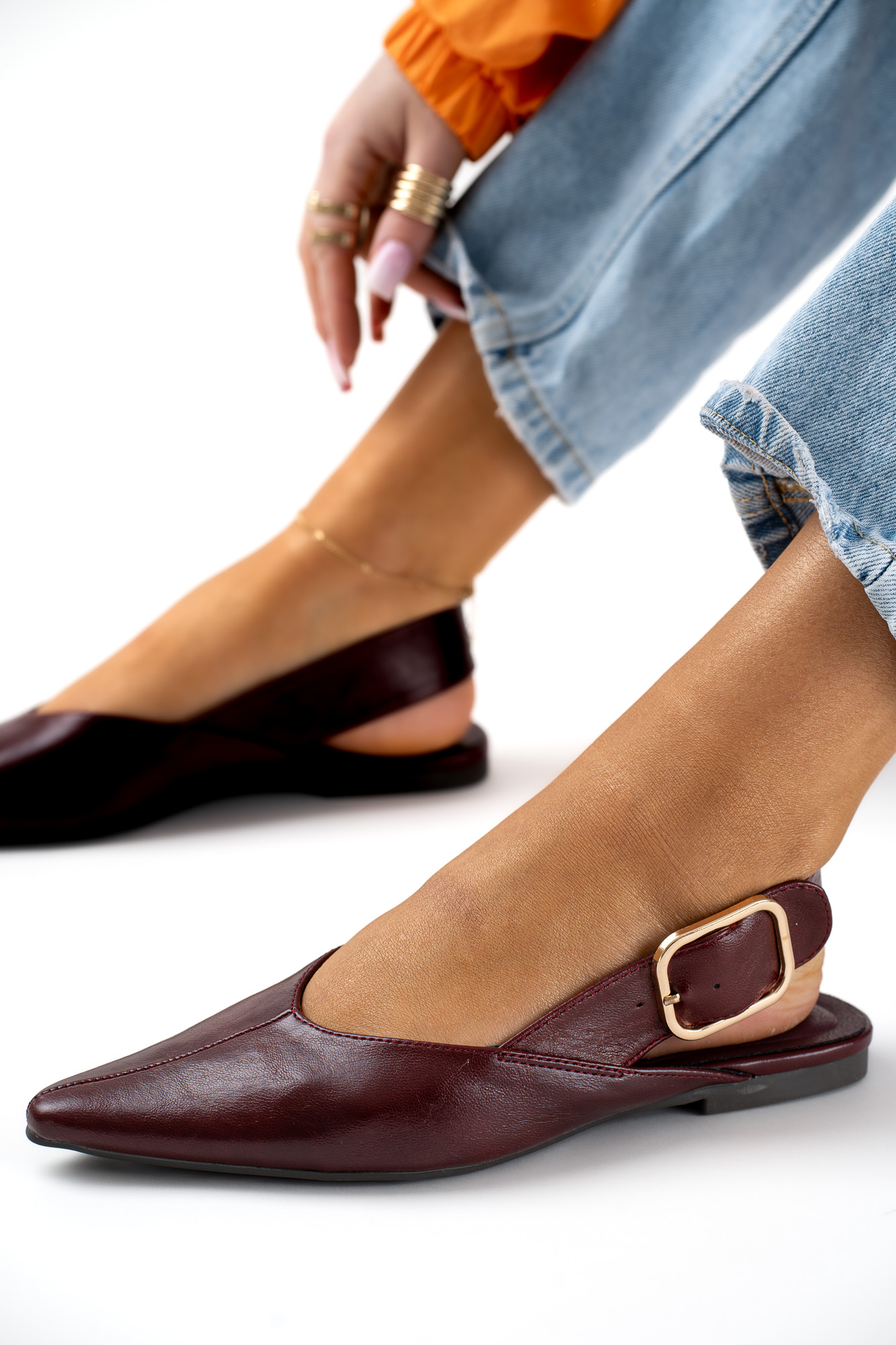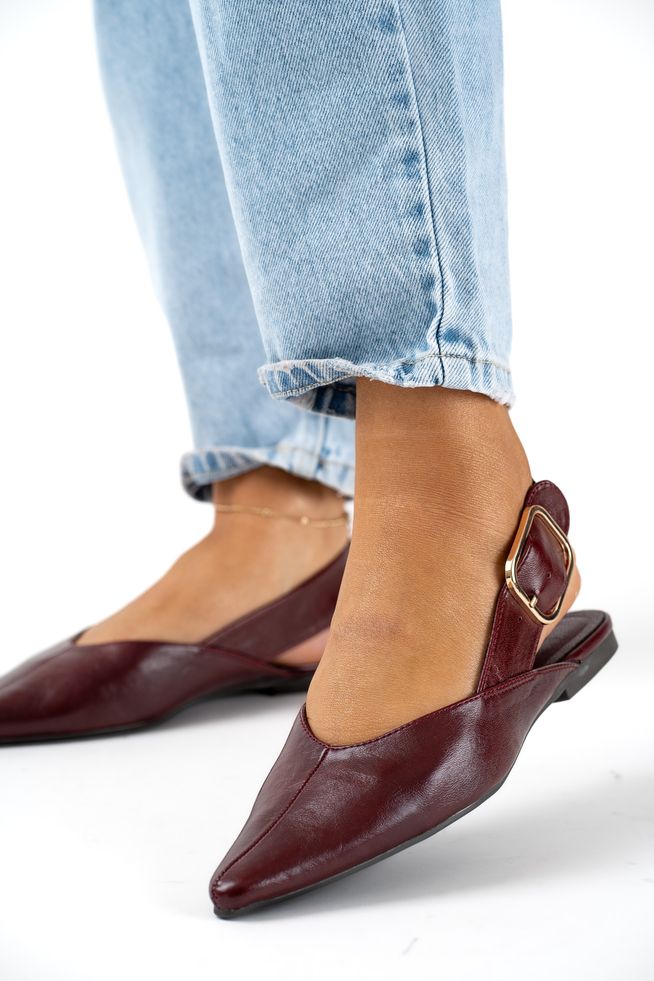 Stylowe Bordowe baleriny damskie z regulowanym paskiem, które łączą elegancję z komfortem noszenia.