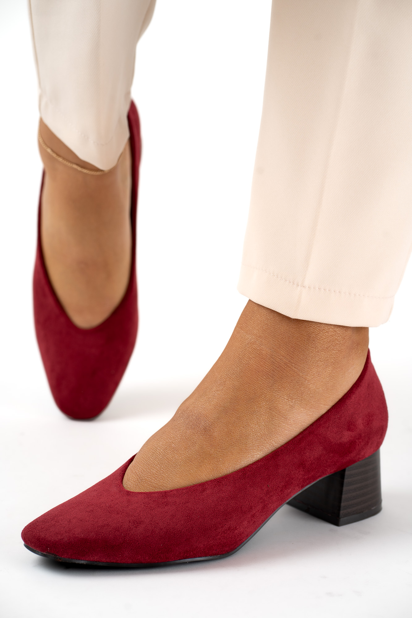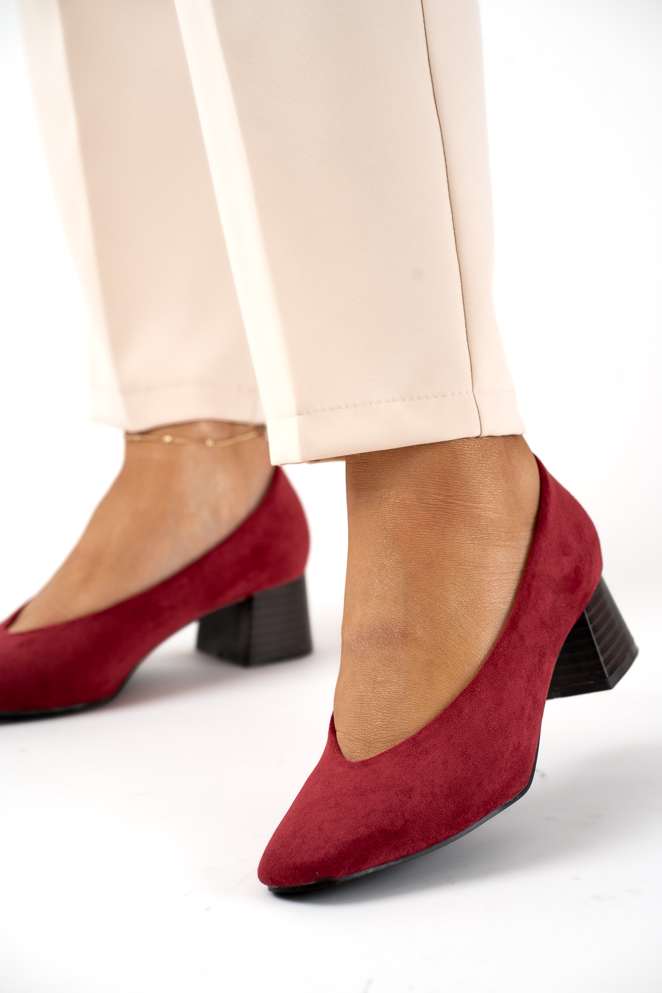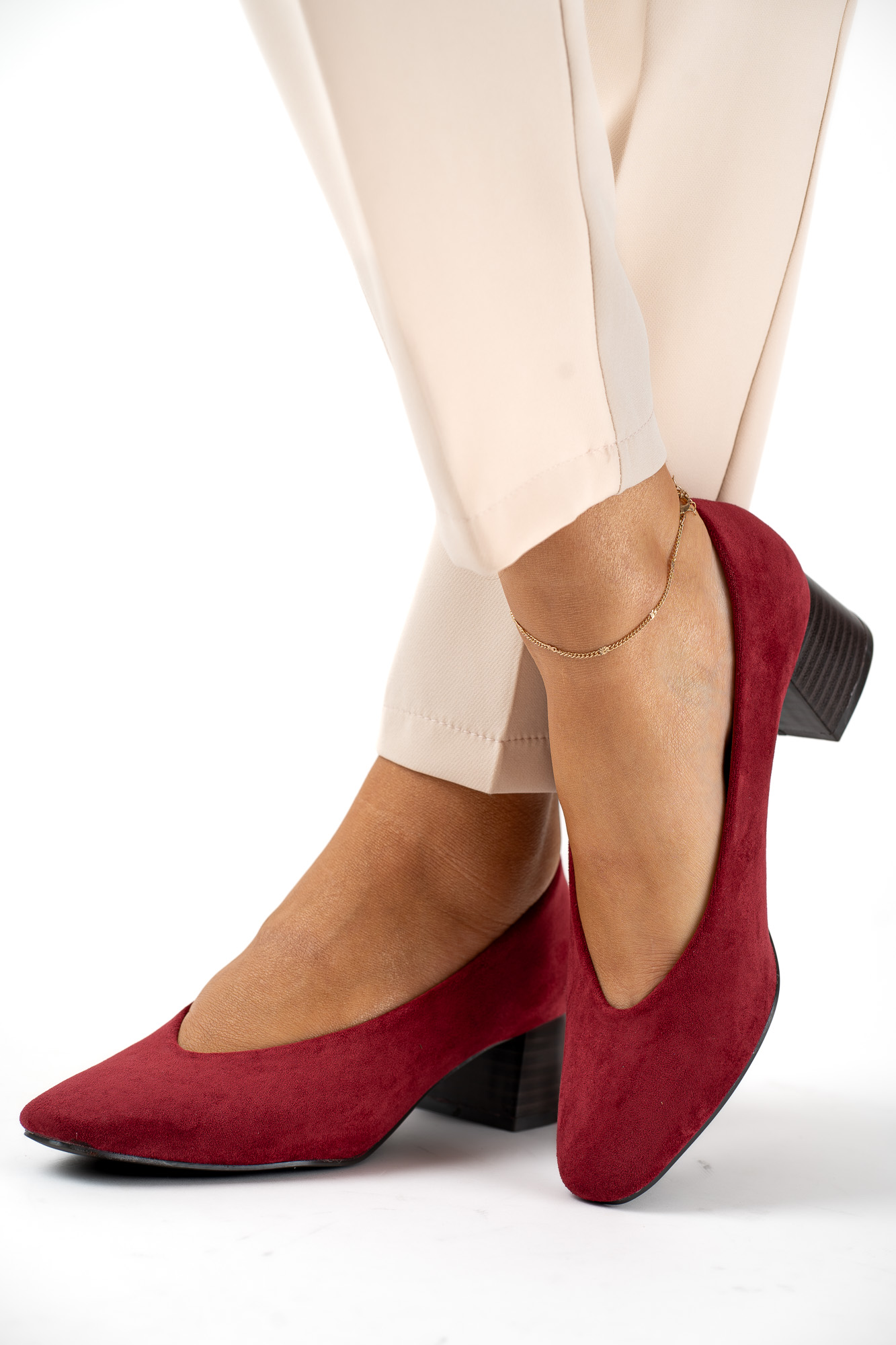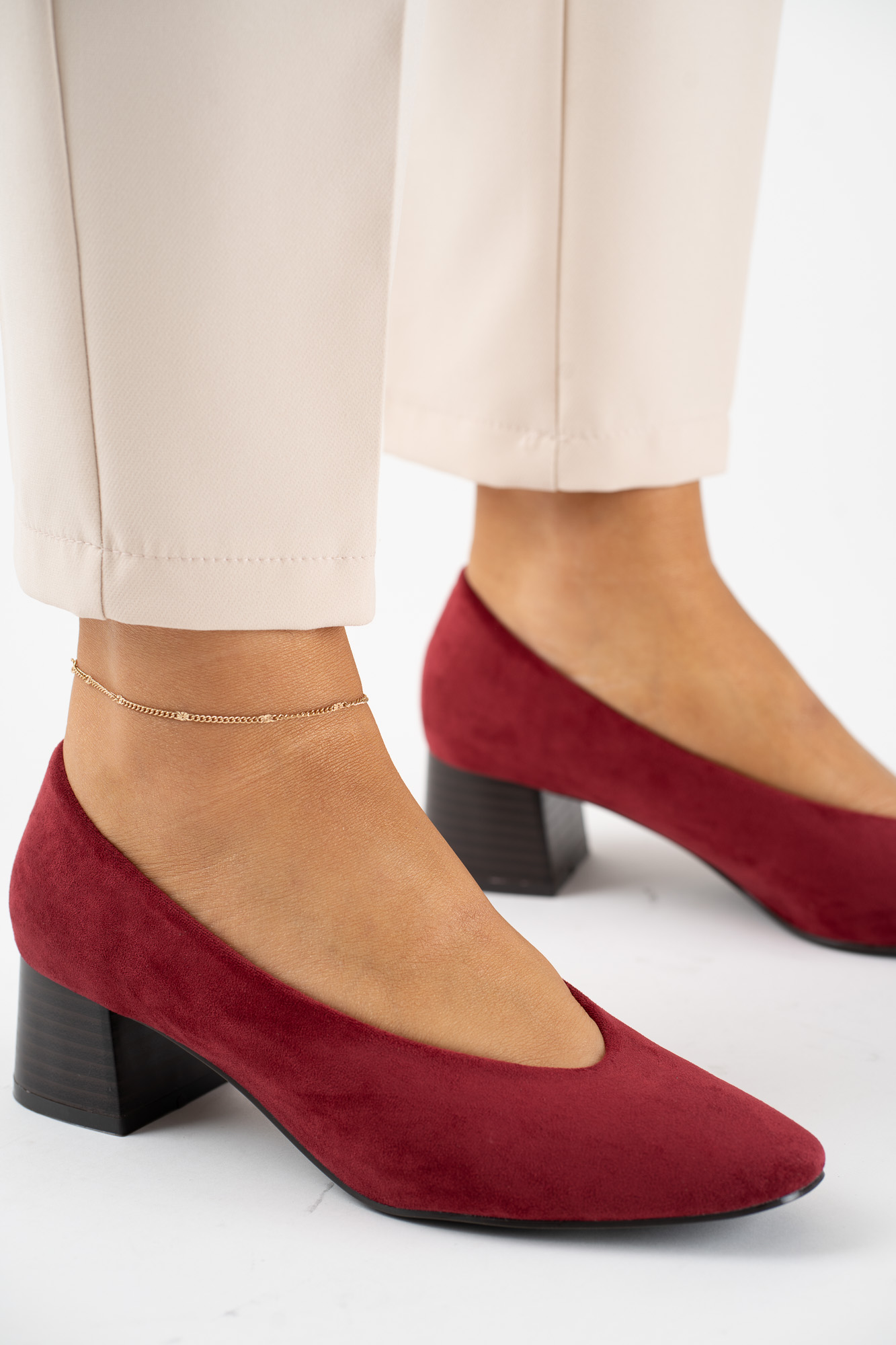 Eleganckie bordowe czółenka damskie wykonane z miękkiego zamszu, osadzone na stabilnym obcasie zapewniającym komfort przez cały dzień.