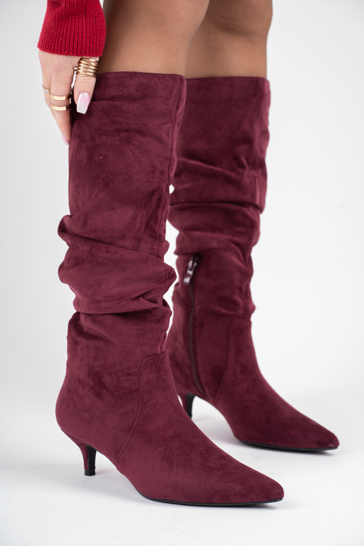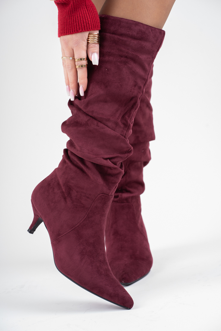 Bordowe zamszowe kozaki damskie na niskiej szpilce