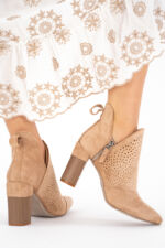 Brązowe Ażurowe jesienne botki damskie na słupku Morizon