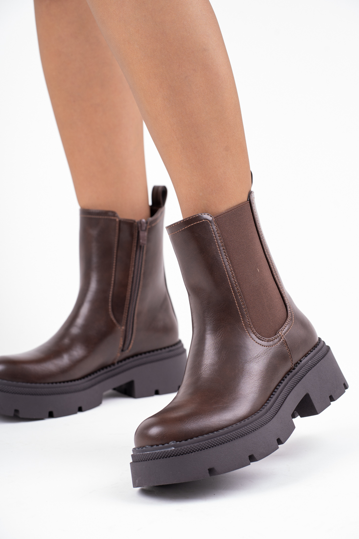 Brązowe botki damskie na płaskim spodzie z gumami