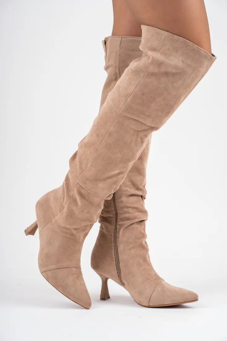 Brązowe długie zamszowe kozaki damskie na szpilce