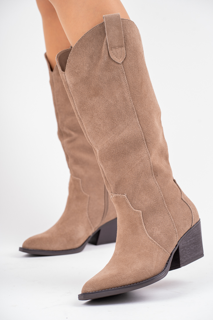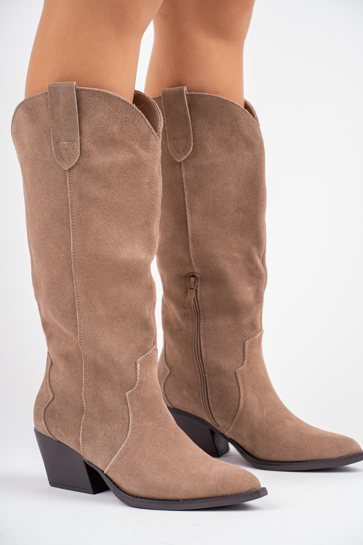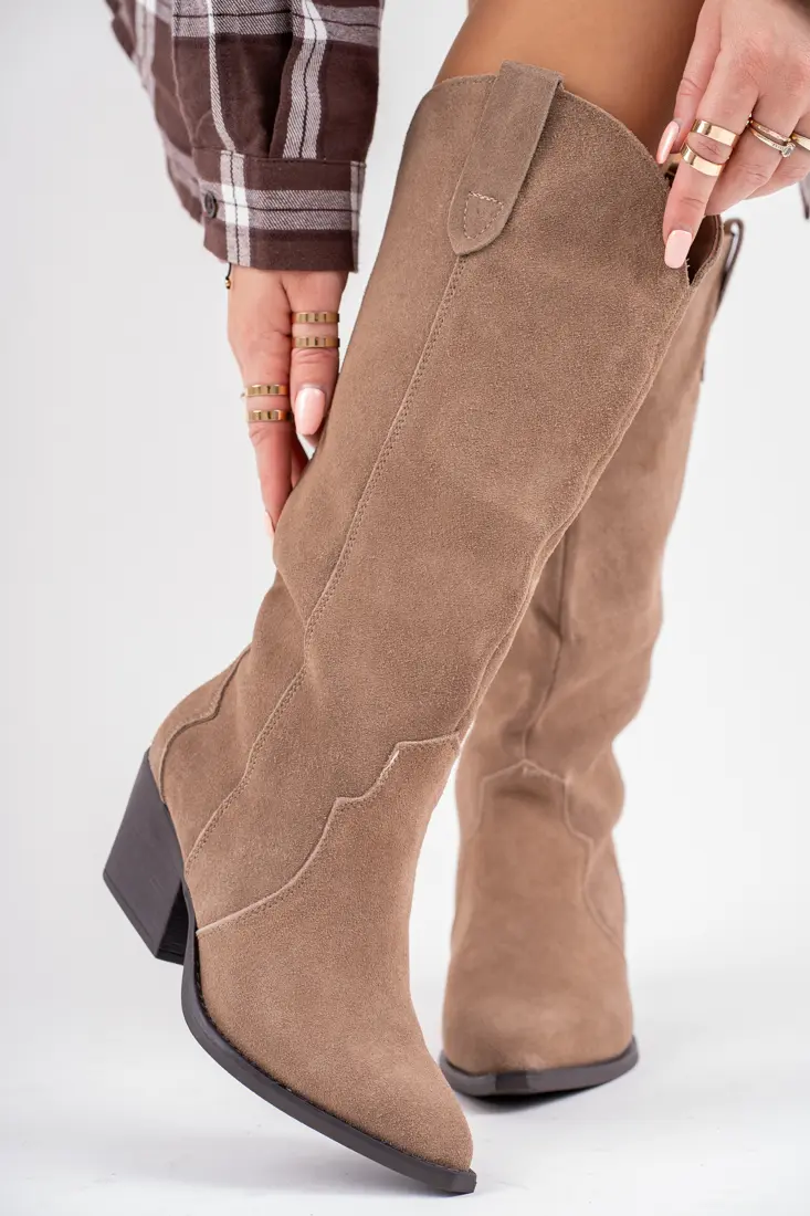Beżowe zamszowe botki kowbojki na obcasie z dłuższą cholewką