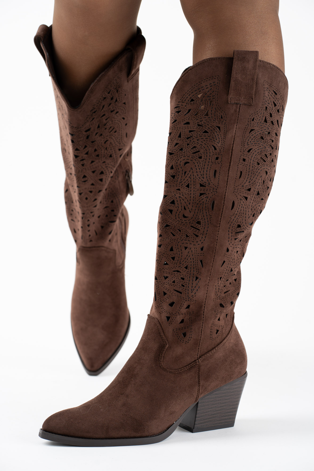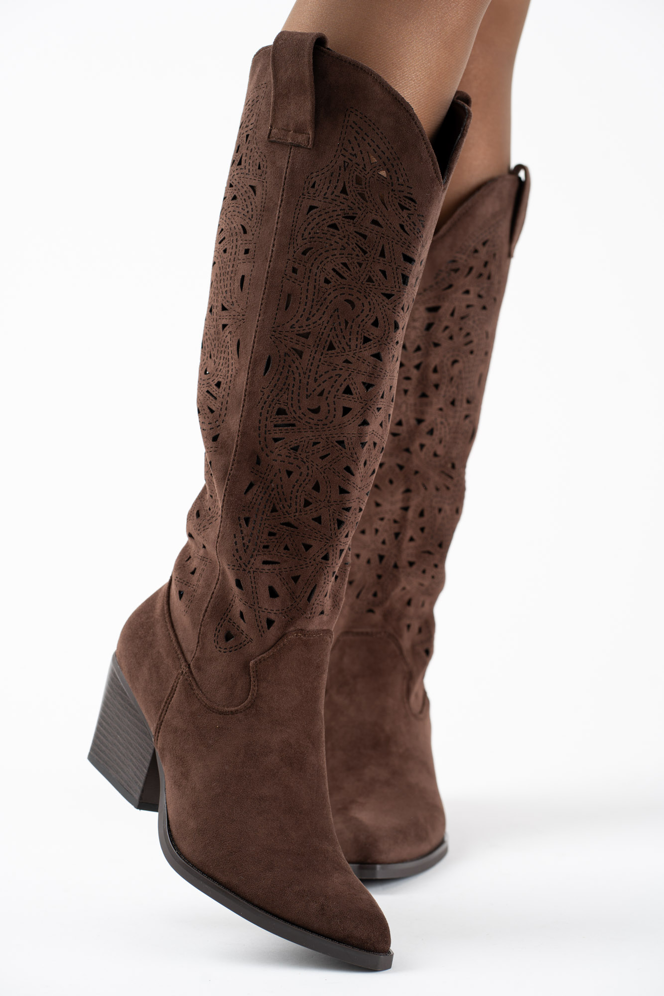 Brązowe Kozaki damskie kowbojki ażurowe na obcasie