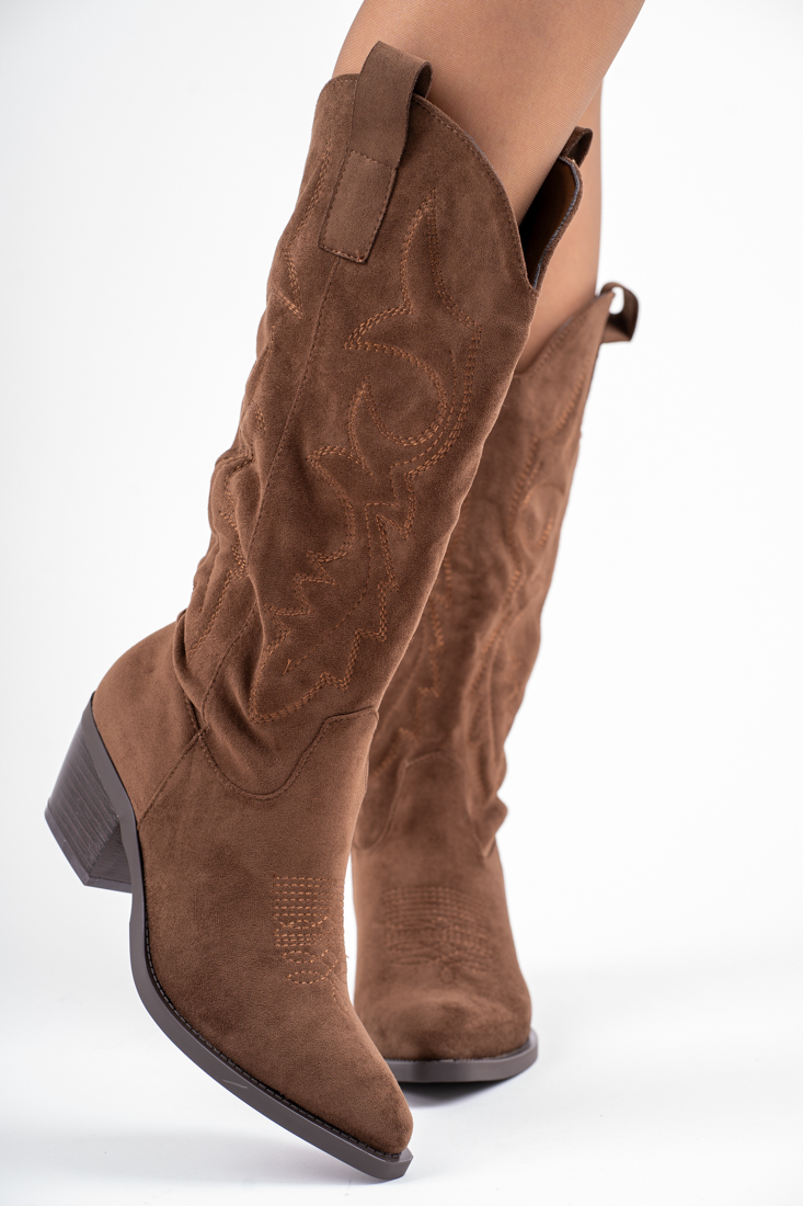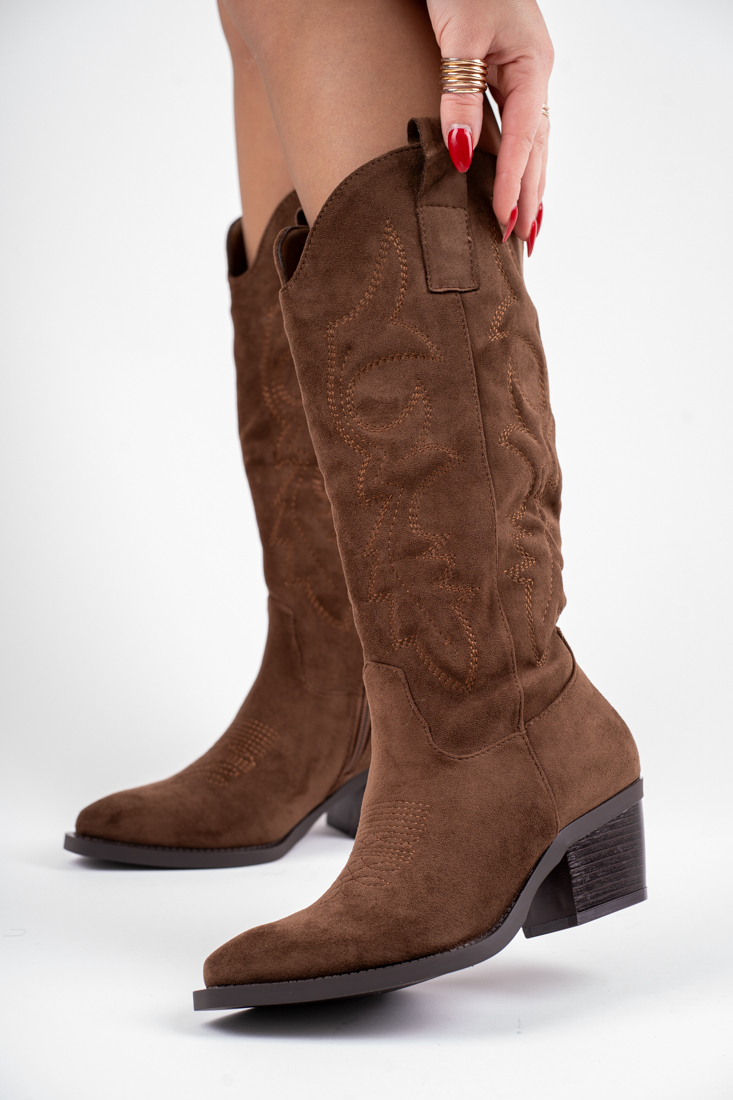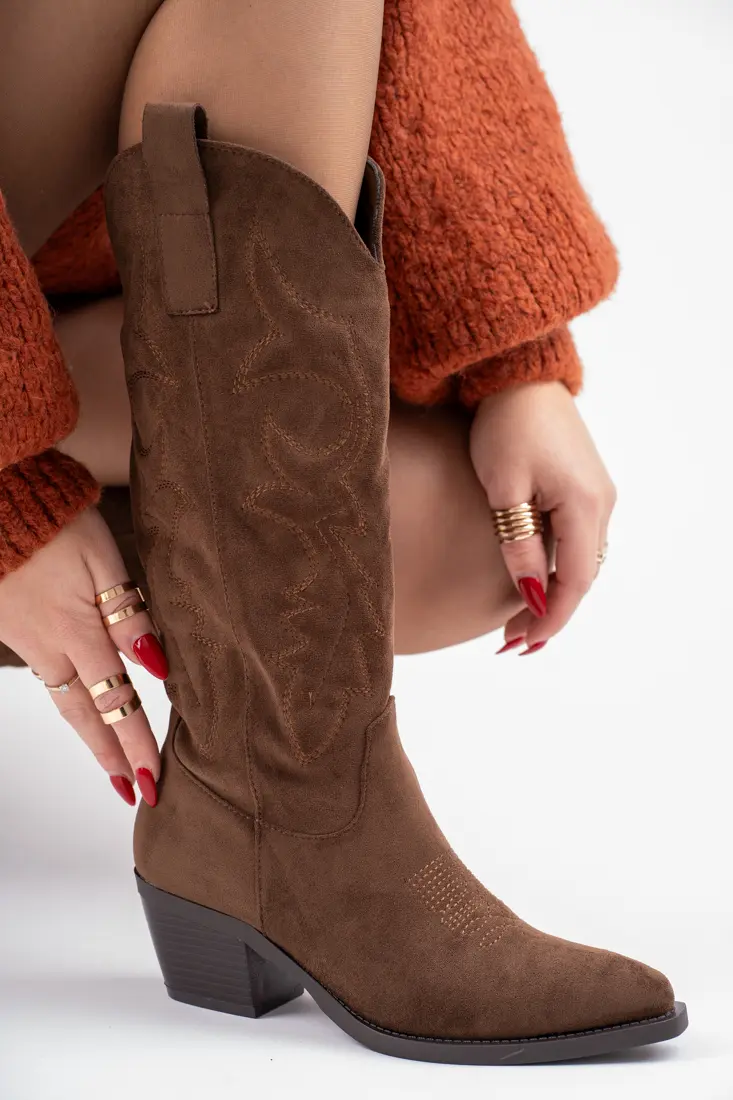 Brązowe kozaki kowbojki damskie na niskim obcasie