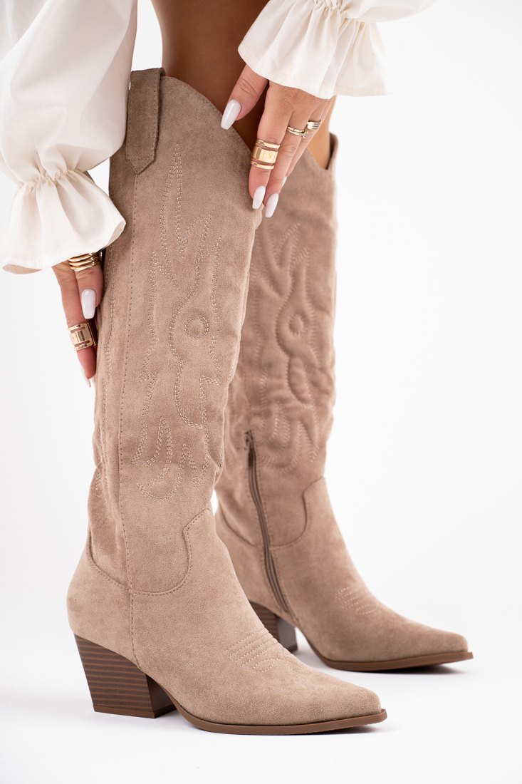 Eleganckie zamszowe kowbojki z suwakiem po boku.