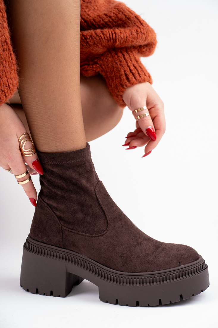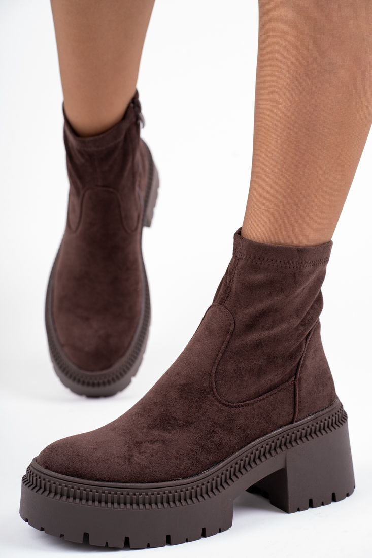 Sklep Brązowe krótkie botki damskie na grubym spodzie