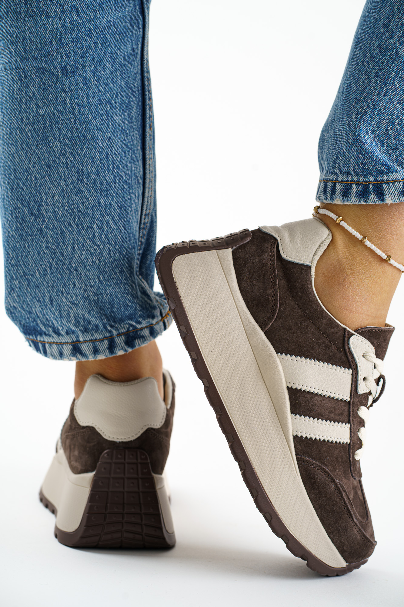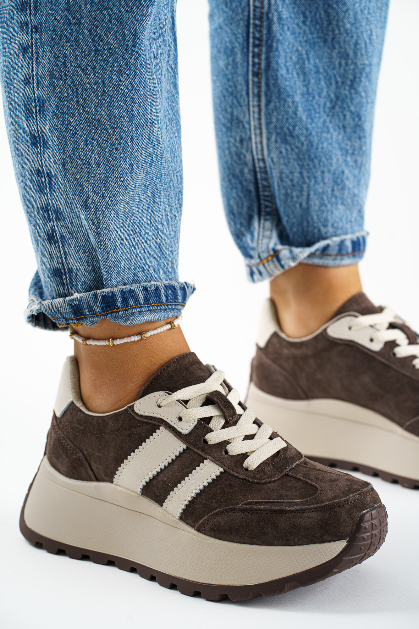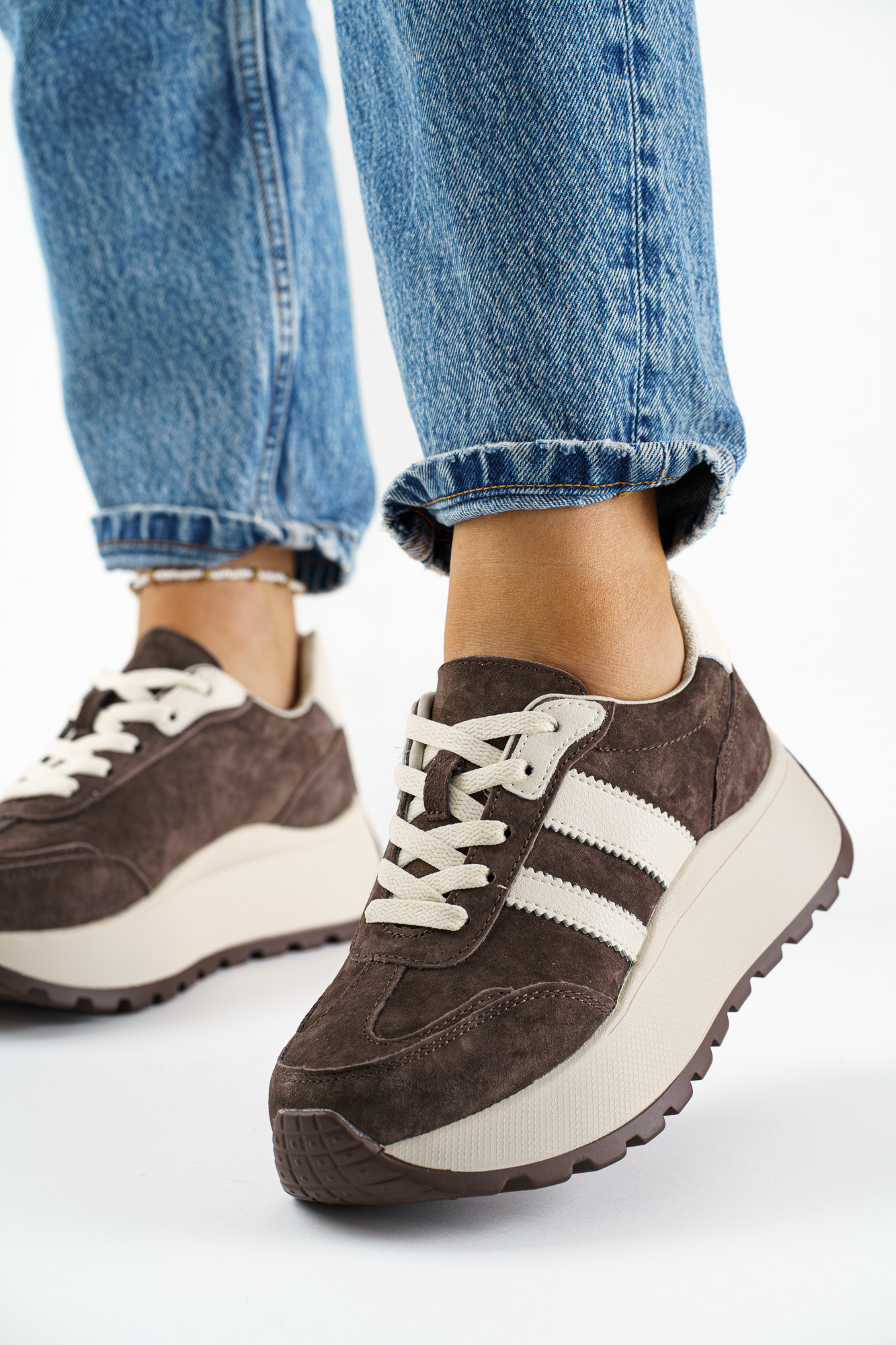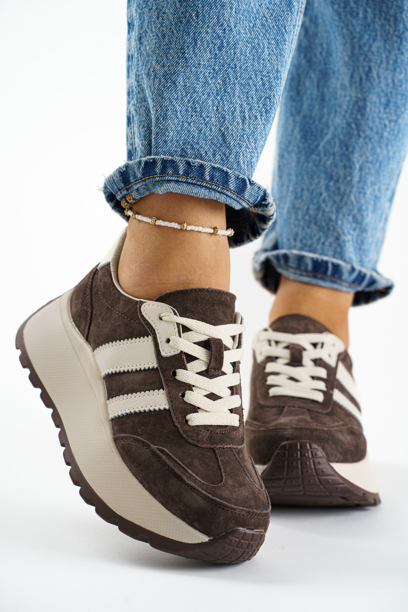 Stylowe Brązowe sneakersy damskie wykonane ze skóry naturalnej, łączące sportowy charakter z eleganckim wykończeniem.