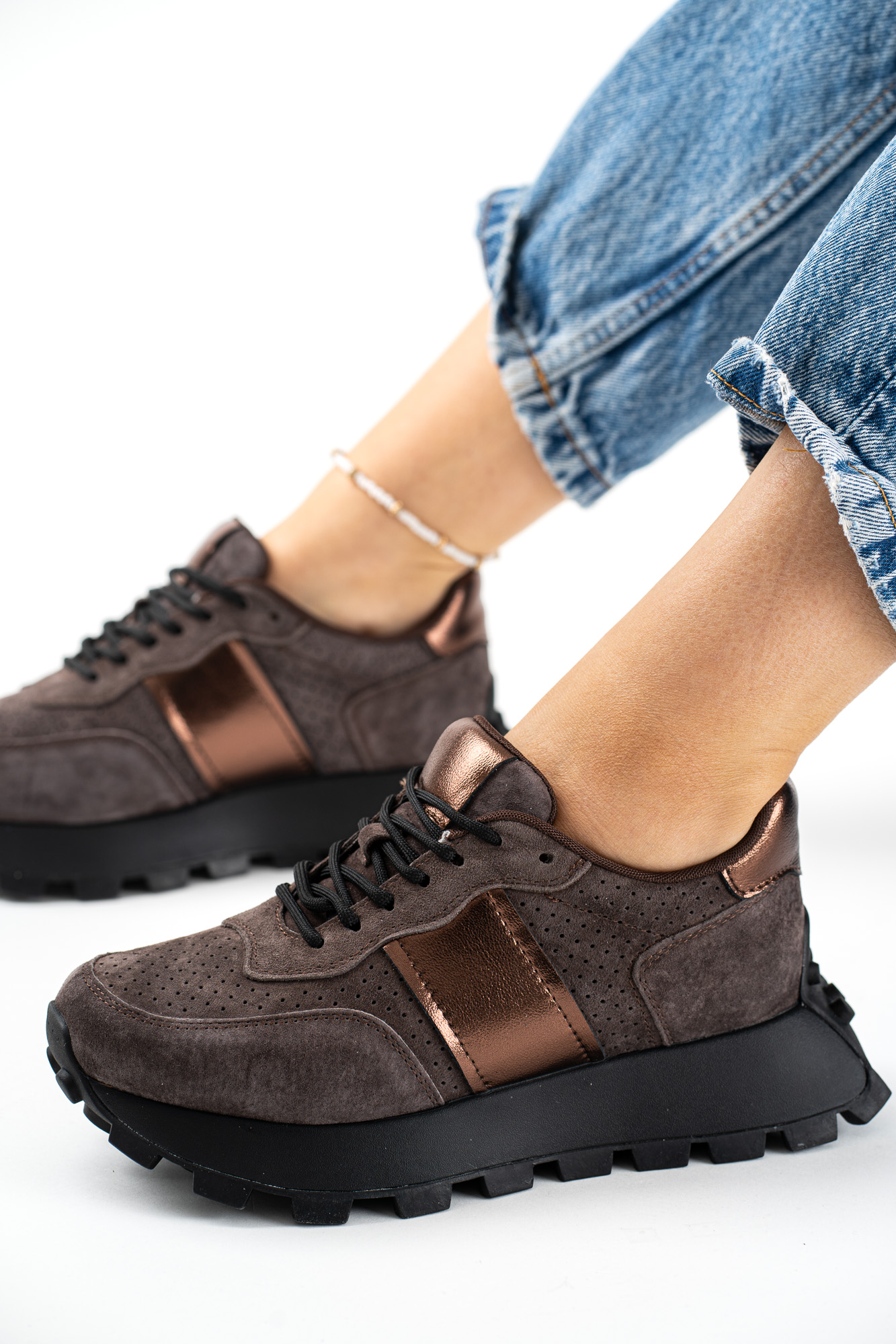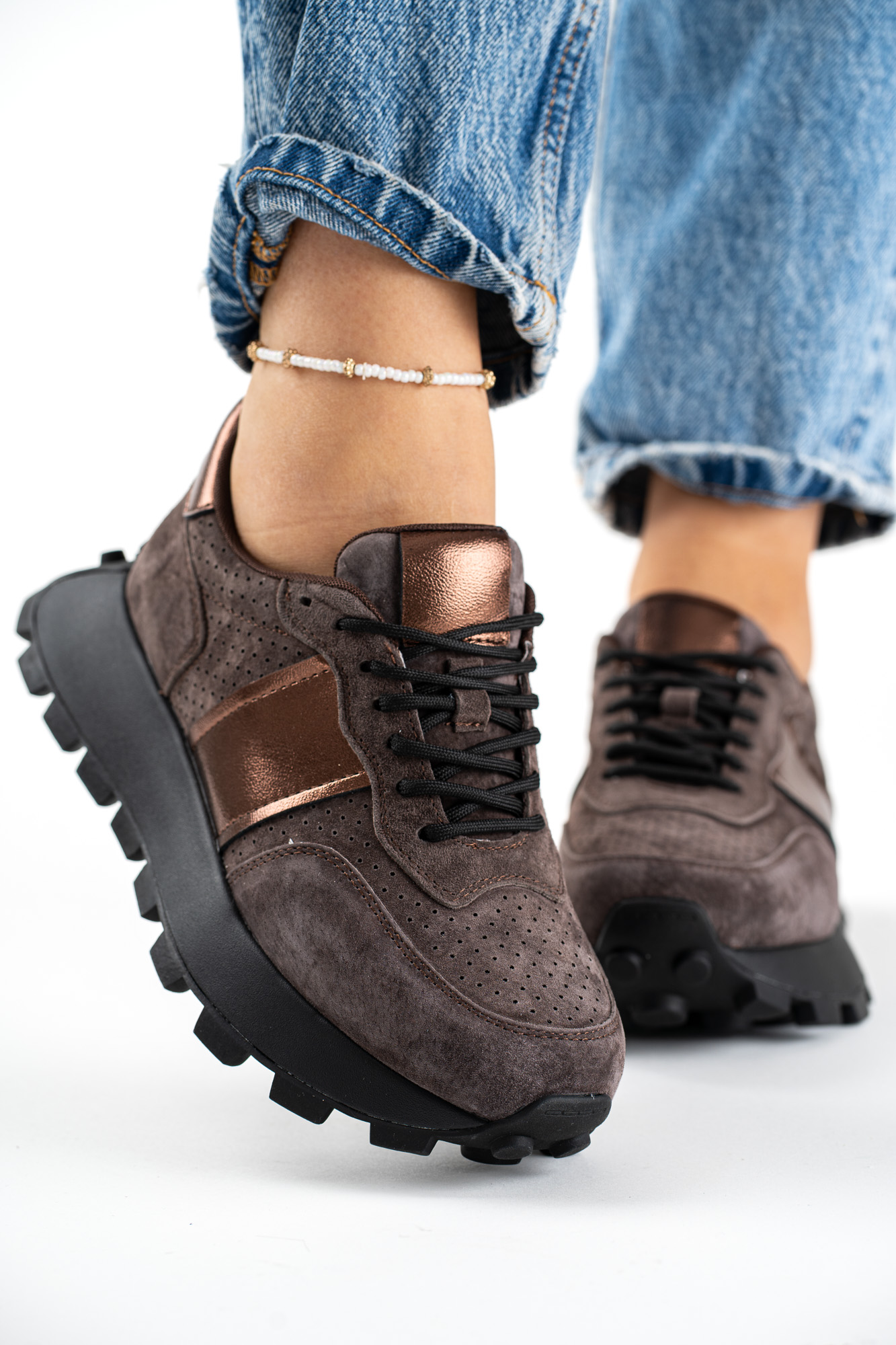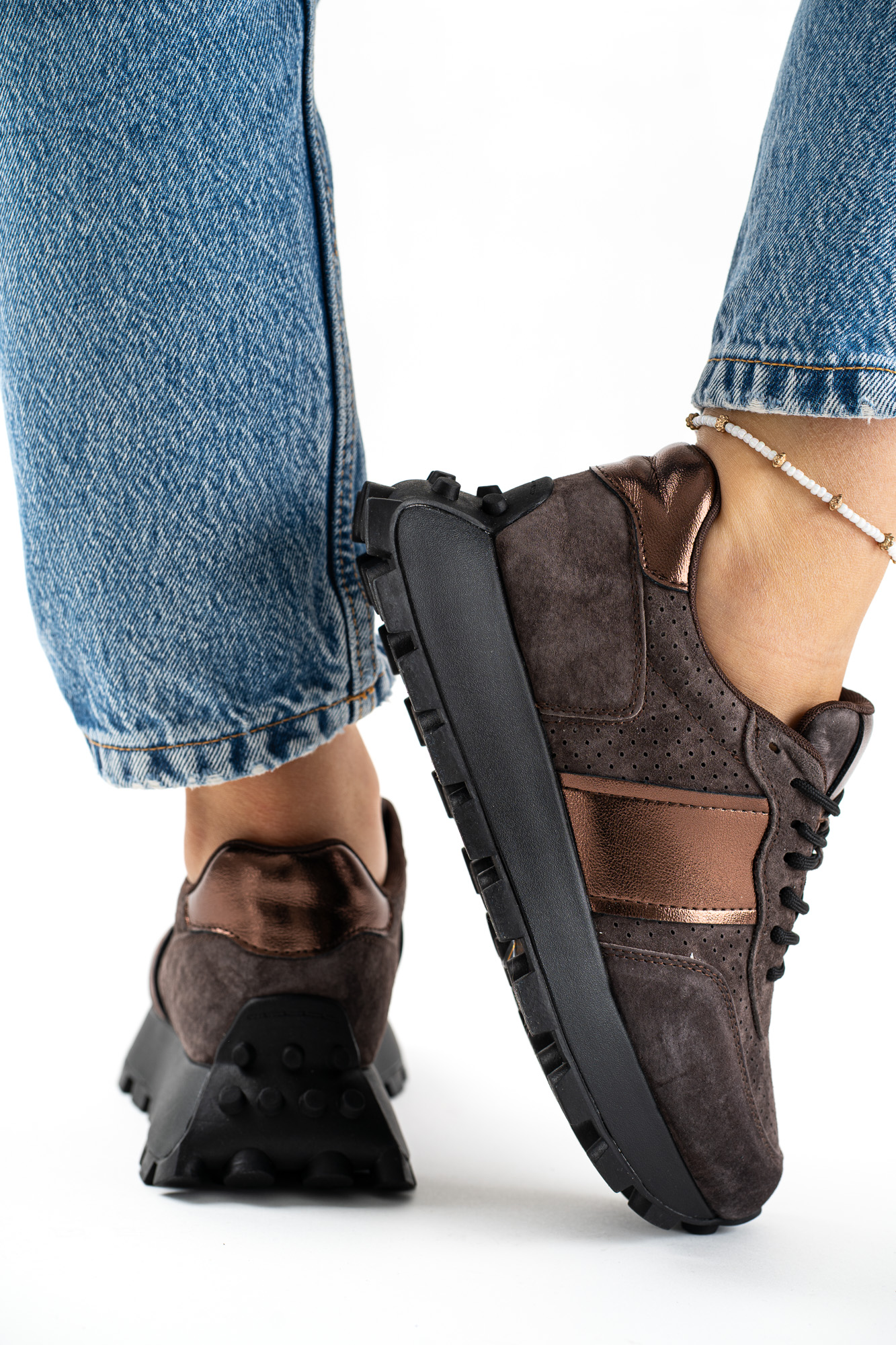 Eleganckie brązowe sneakersy damskie wykonane ze skóry naturalnej, łączące modny design z wygodą codziennego użytkowania.