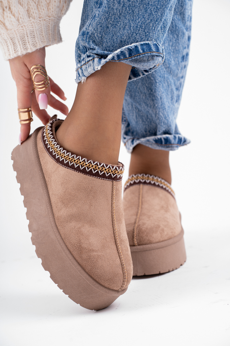 Brązowe śniegowce kapcie damskie na platformie