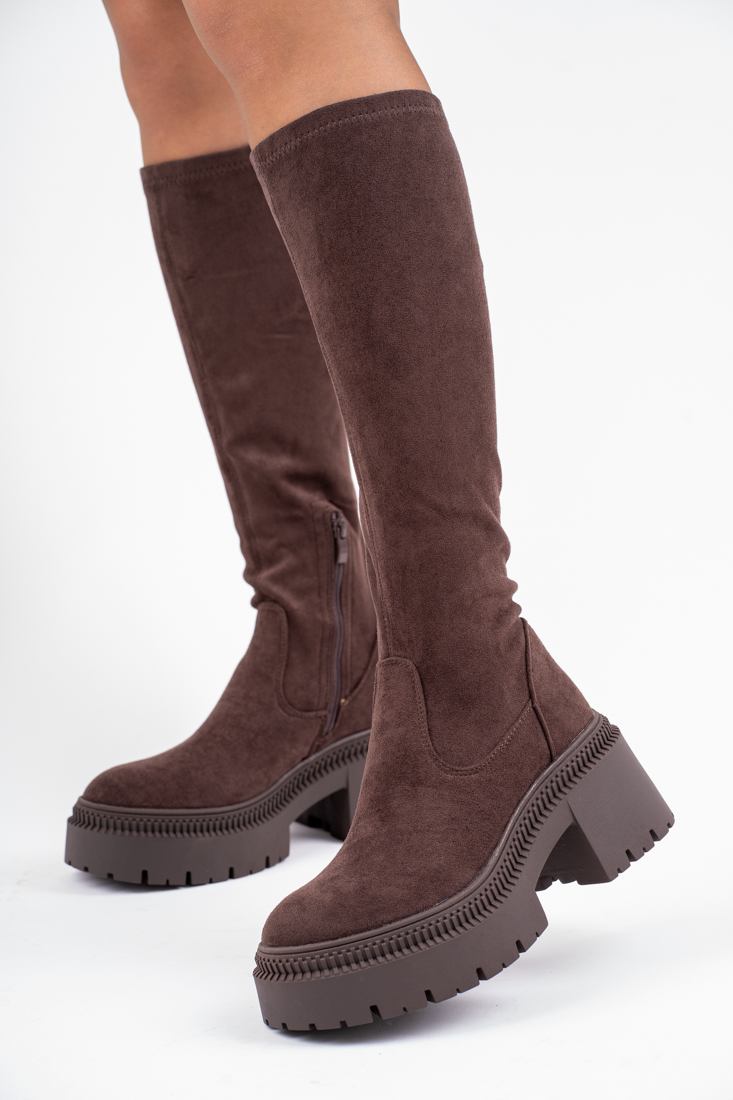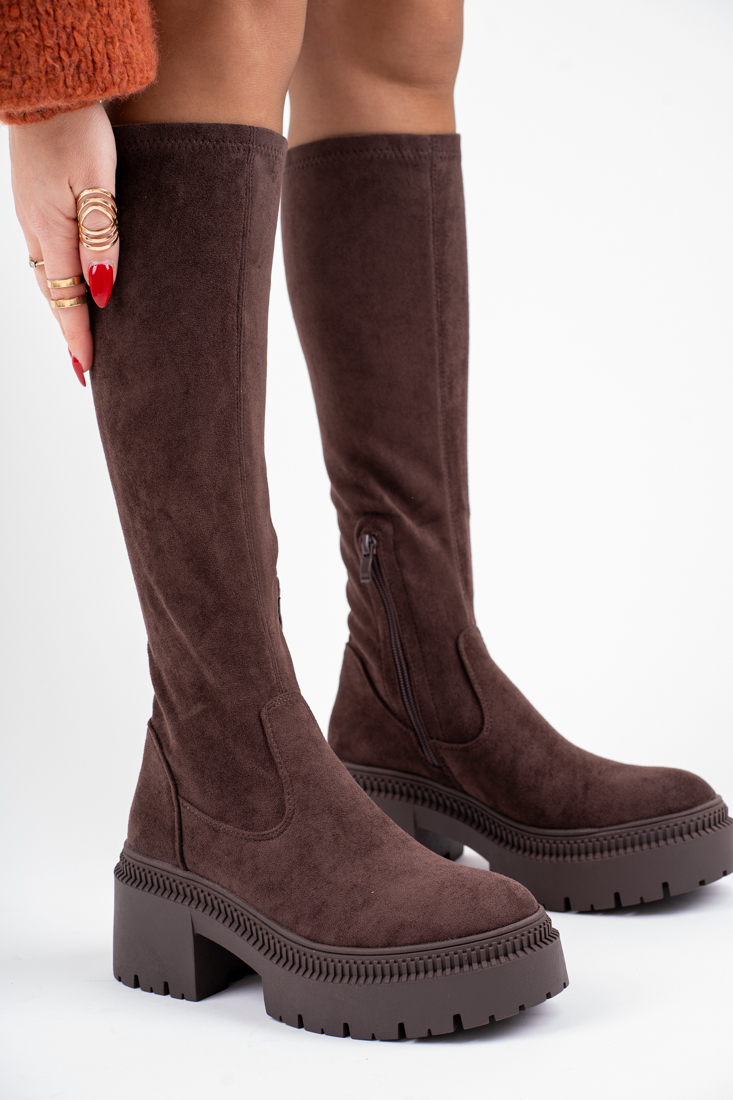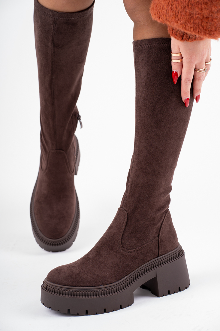 Sklep Brązowe zamszowe kozaki na płaskiej grubej podeszwie