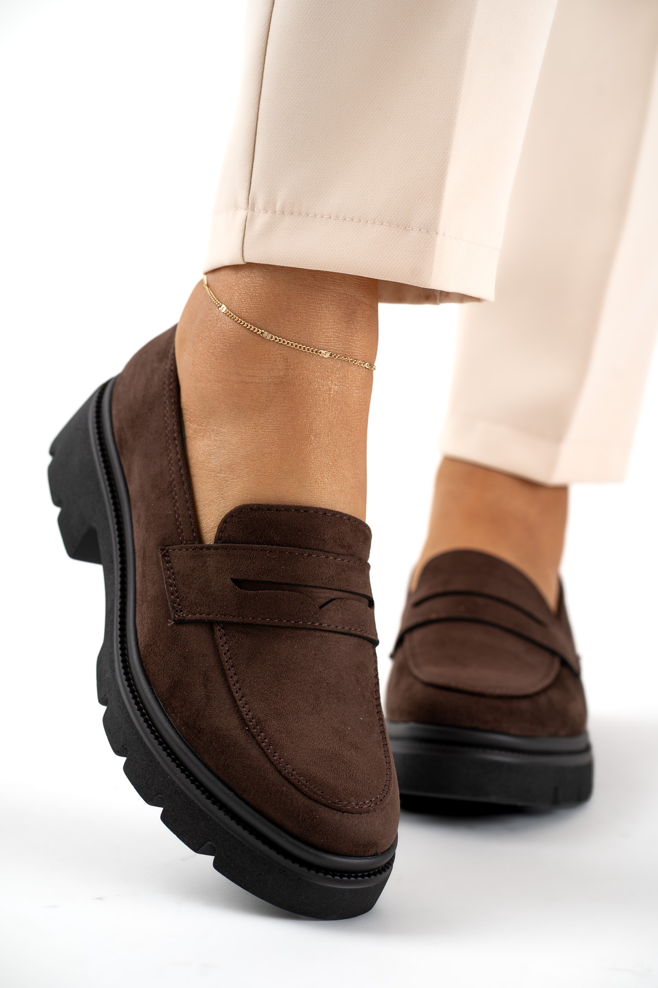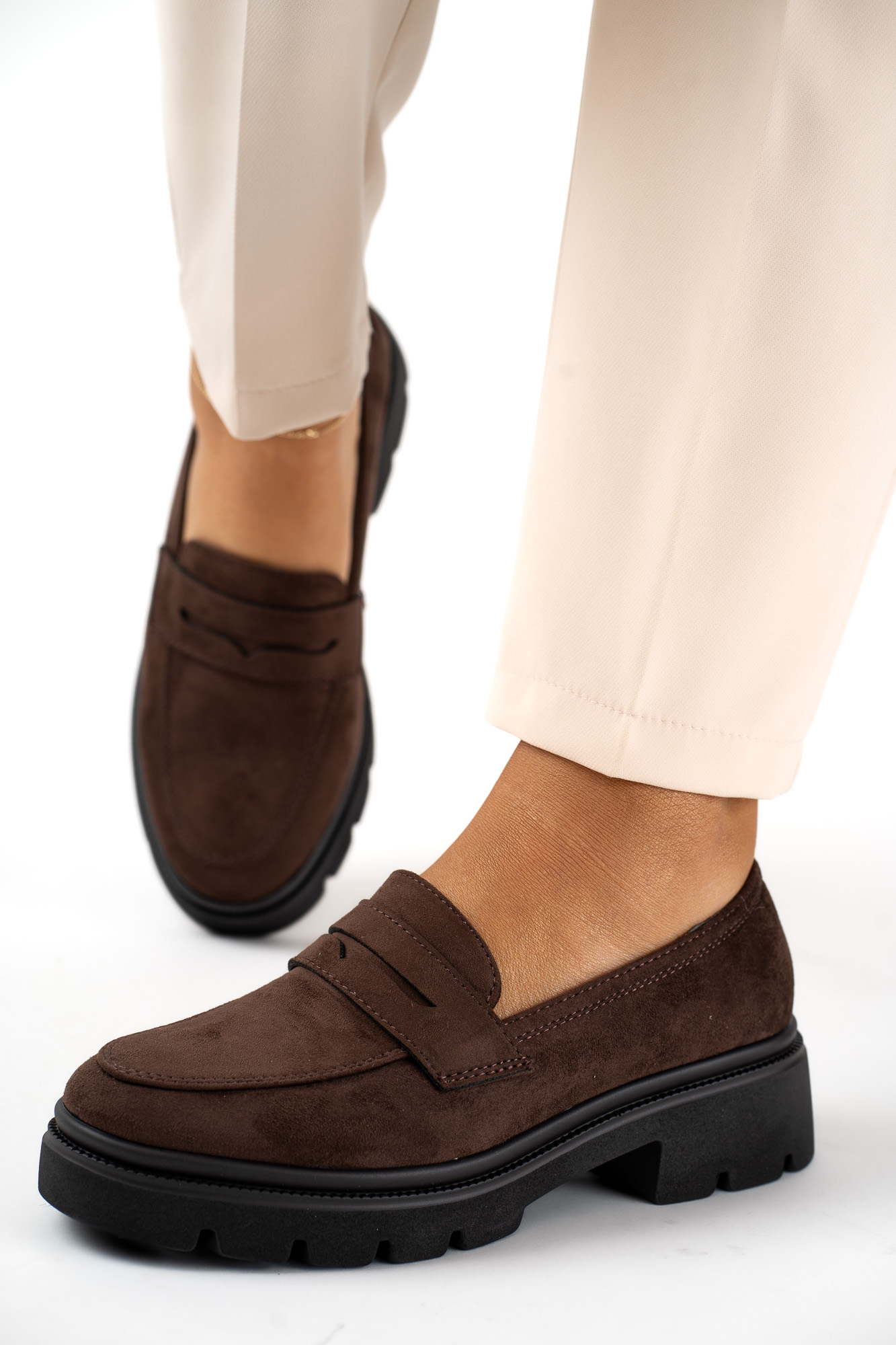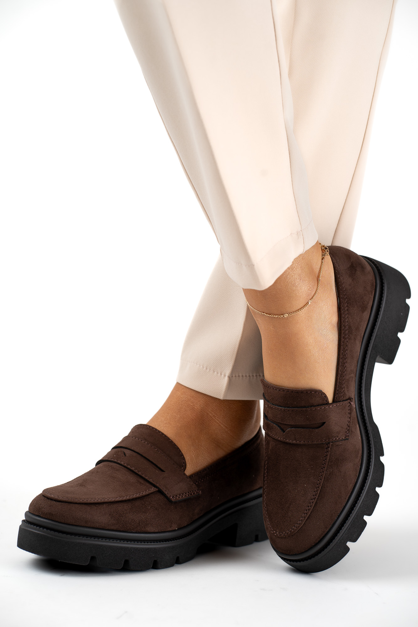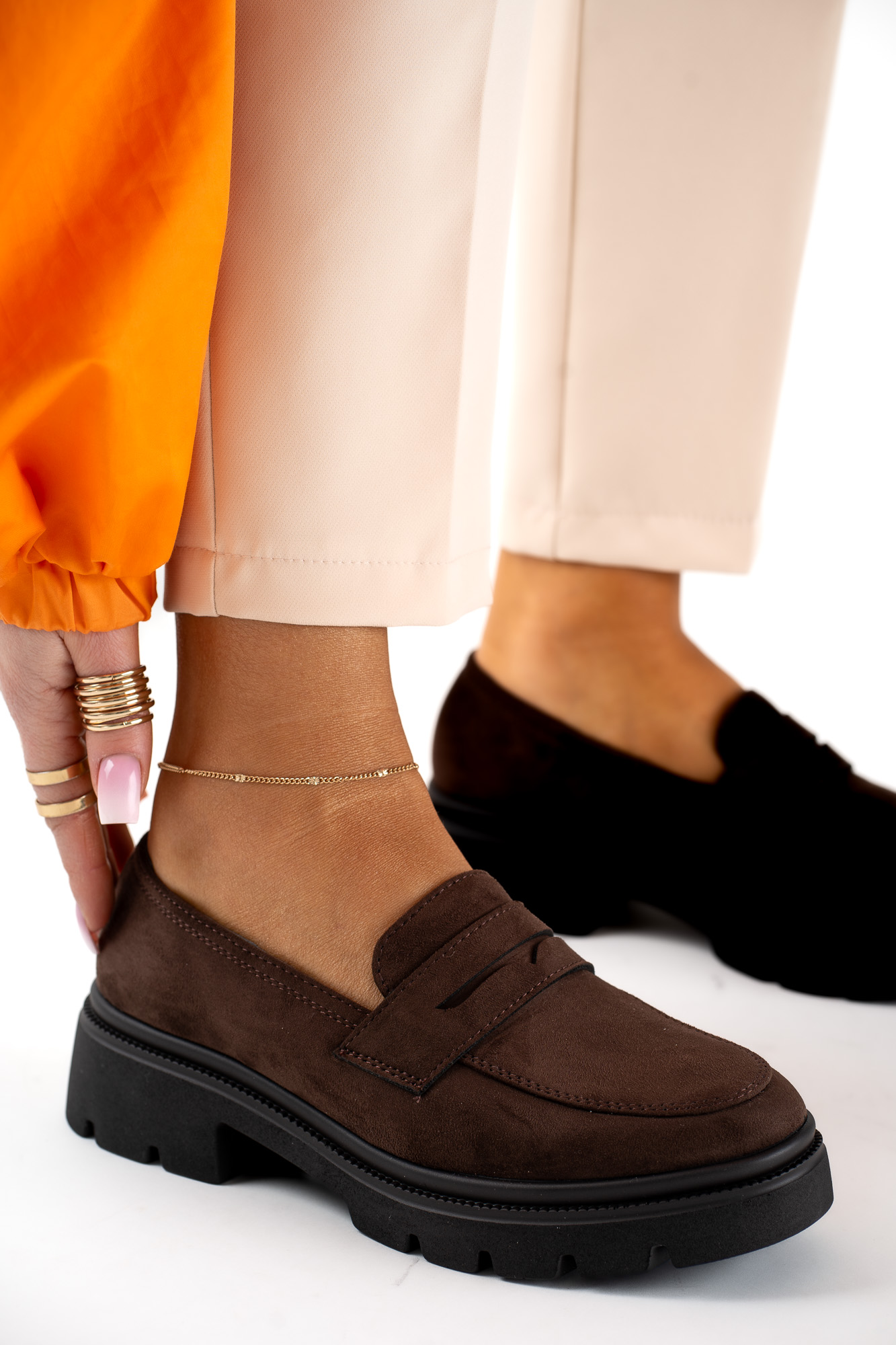 Klasyczne mokasyny damskie wykonane z miękkiego materiału zamszowego w eleganckim brązowym kolorze.