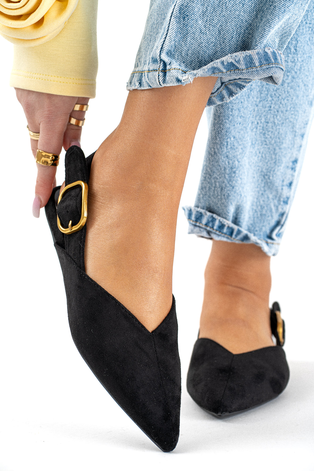 Czarne zamszowe baleriny damskie z paskiem