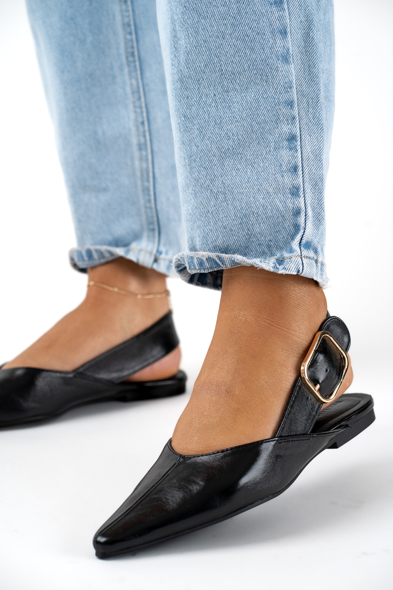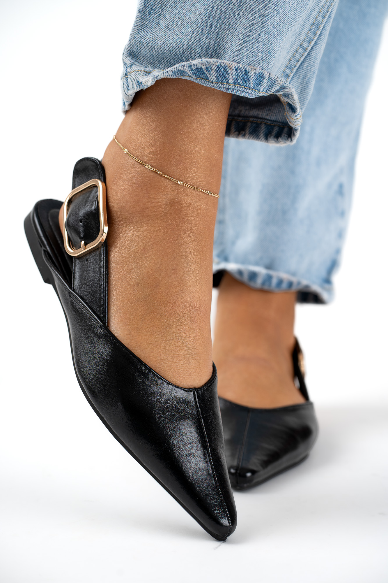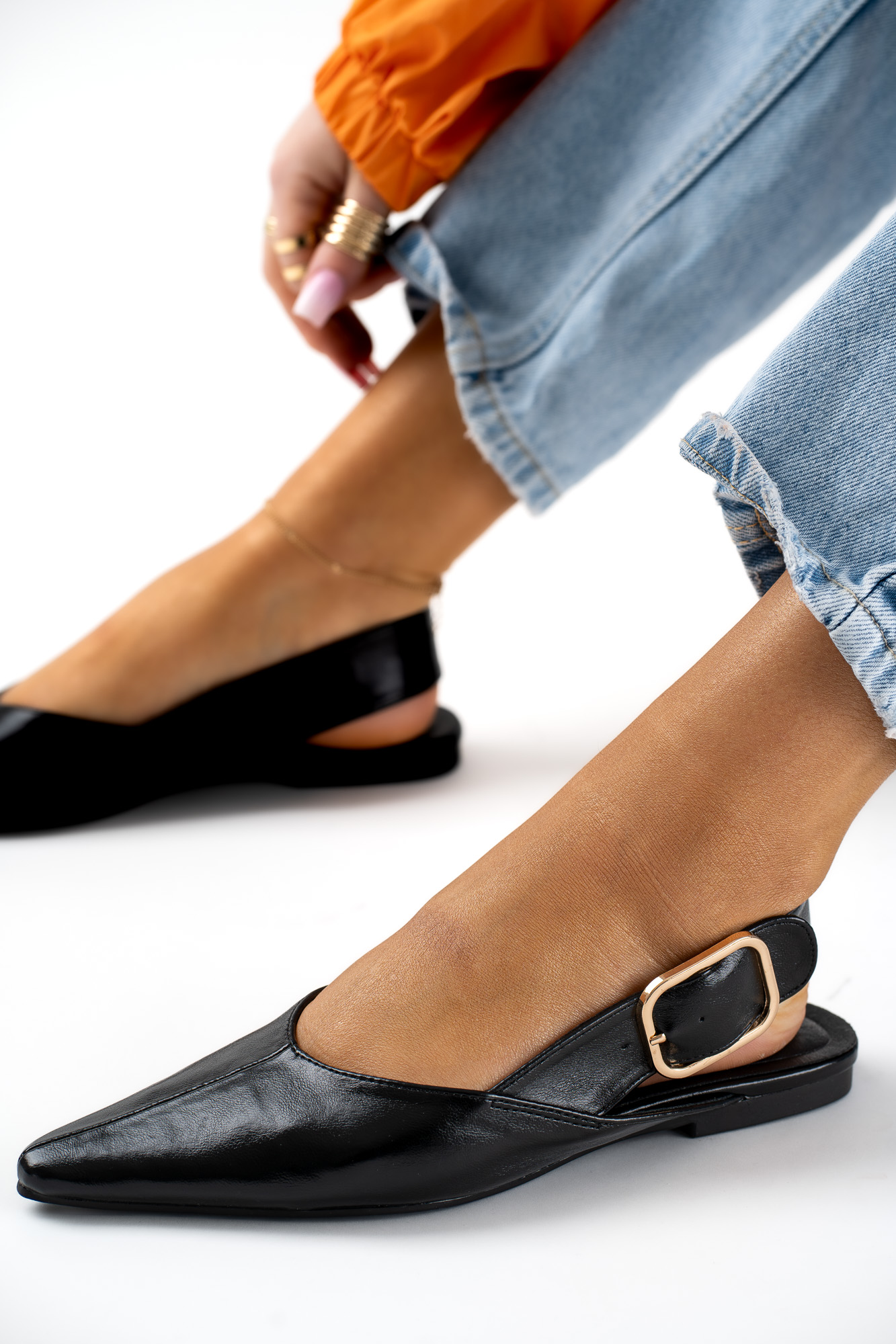 Stylowe czarne baleriny damskie z regulowanym paskiem, które łączą elegancję z komfortem noszenia.