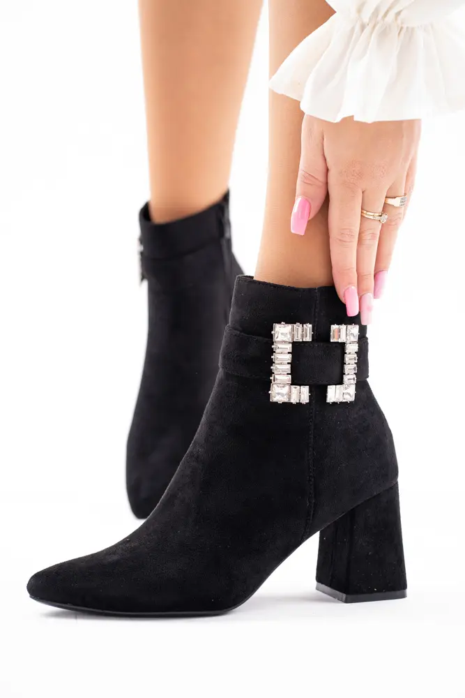Czarne botki na obcasie z efektowną klamrą Lucia