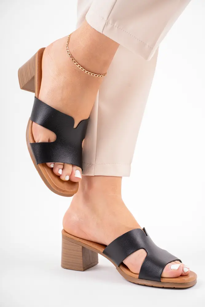 Czarne klapki na niskim obcasie ala Drewno