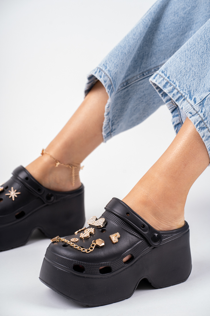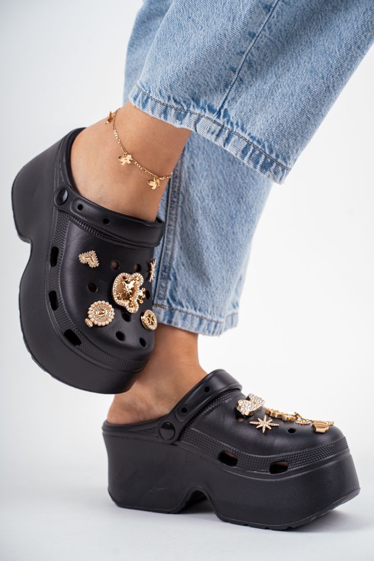 Czarne piankowe klapki na grubym spodzie z metalowymi ozdobami