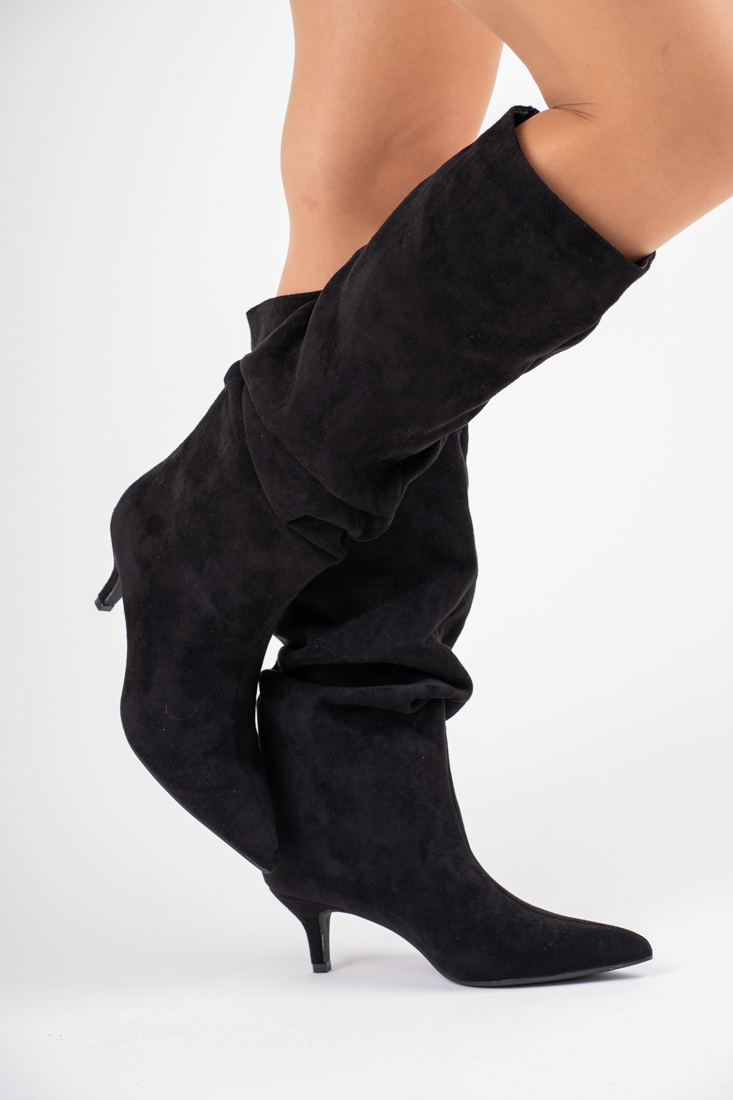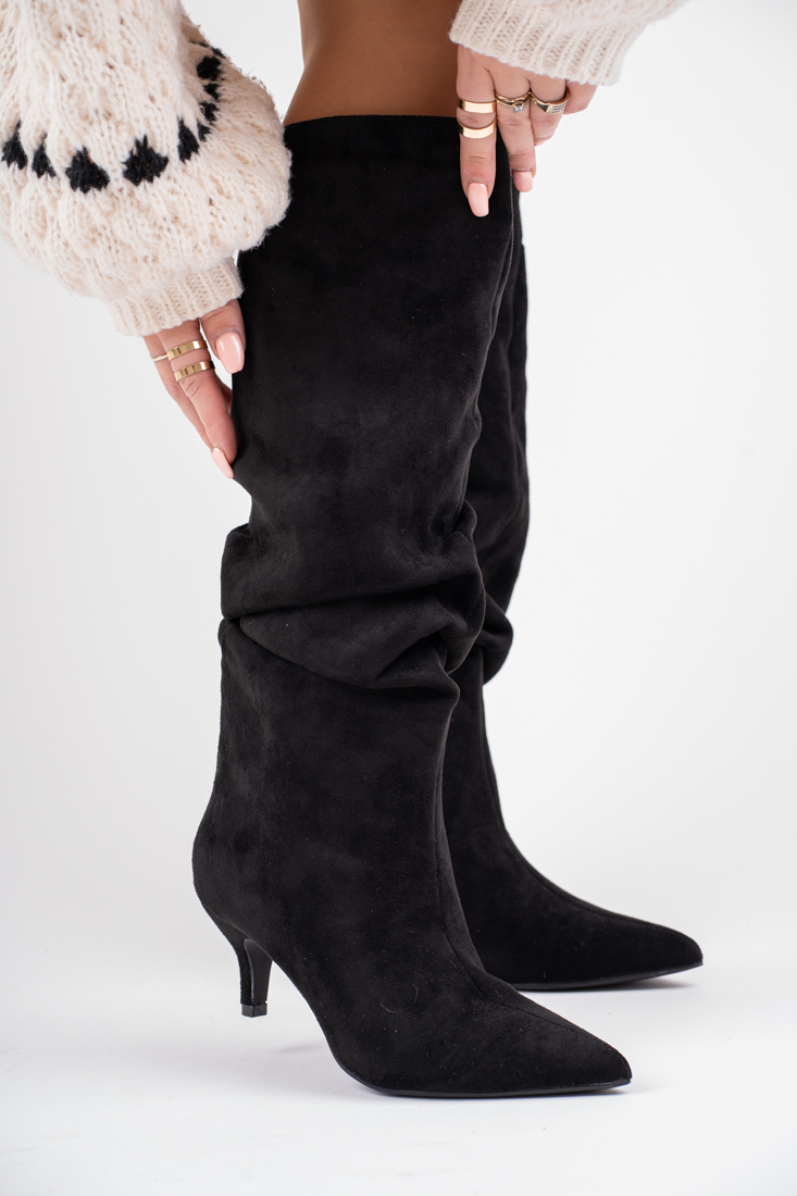 Czarne zamszowe kozaki damskie na niskiej szpilce