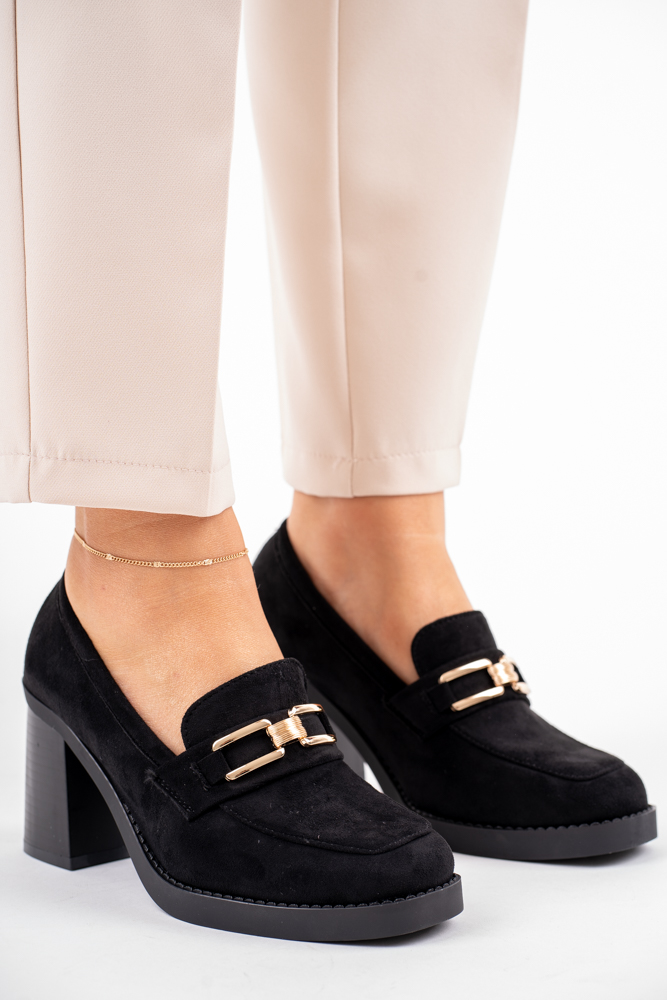 Czarne zamszowe mokasyny damskie na obcasie z klamerką