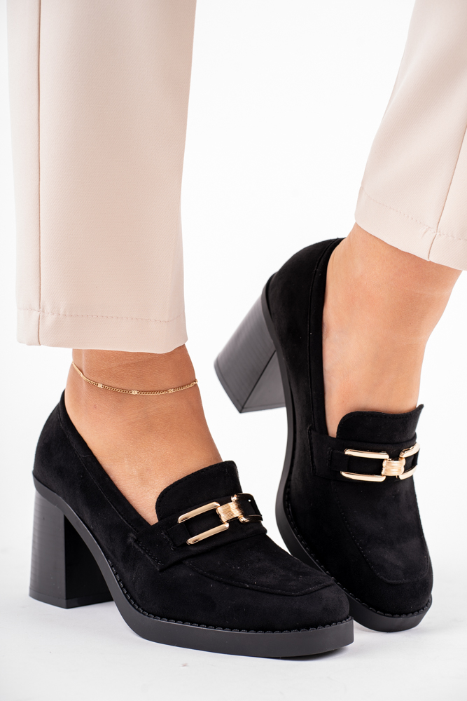 Sklep Czarne zamszowe mokasyny damskie na obcasie z klamerką