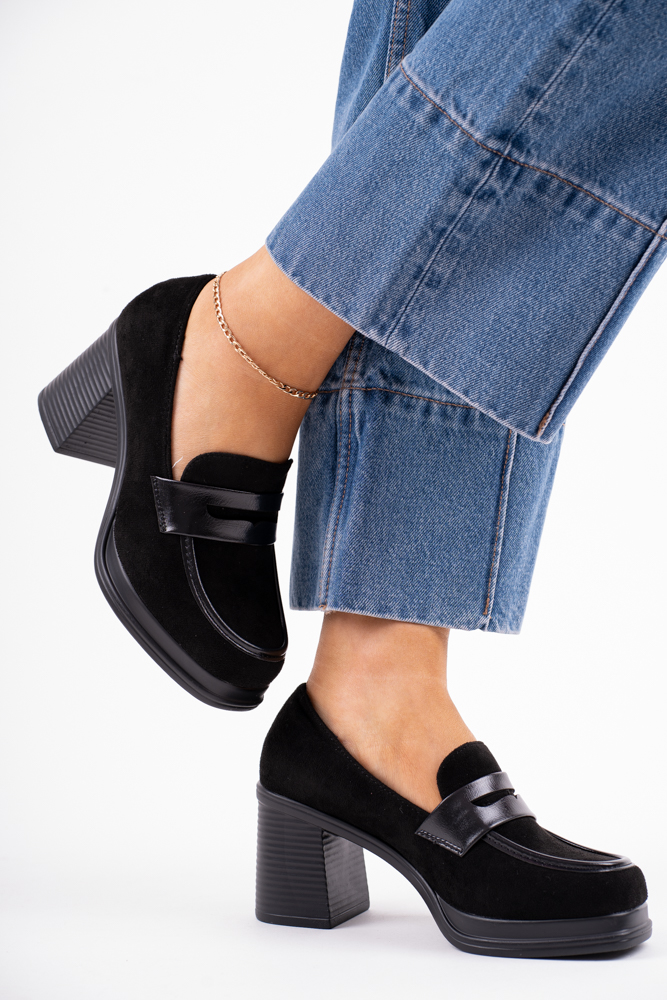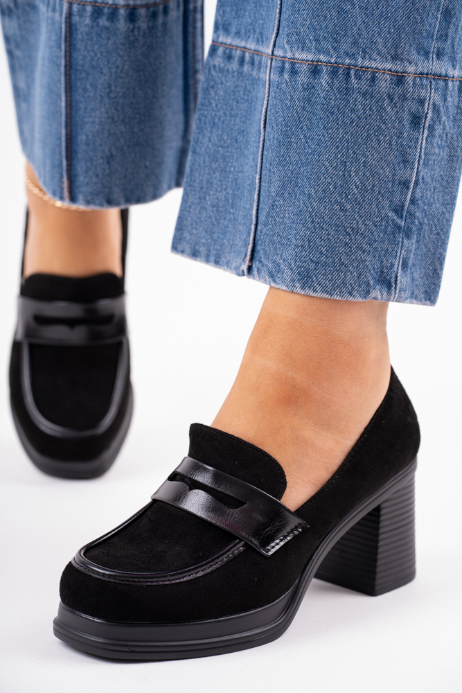 Czarne zamszowe mokasyny na szerokim obcasie