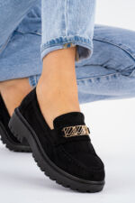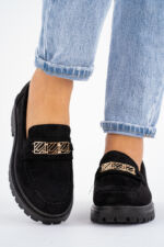 Napisz pierwszą opinię o „Czarne zamszowe mokasyny z złotym emblematem Daisy”