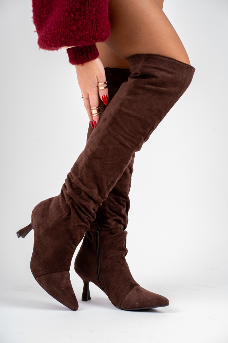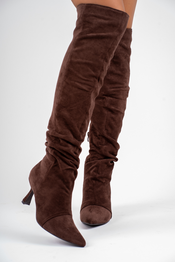 Czekoladowe długie zamszowe kozaki damskie na szpilce