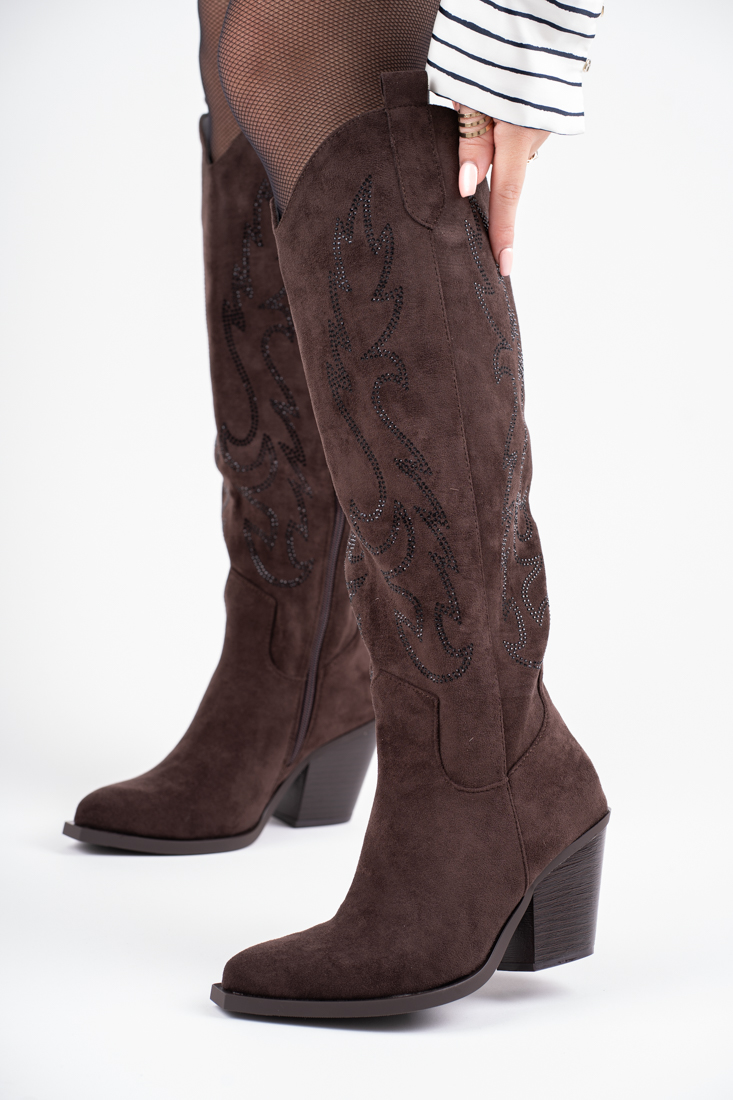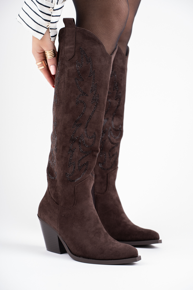 Brązowe kozaki kowbojki damskie na obcasie do kolana