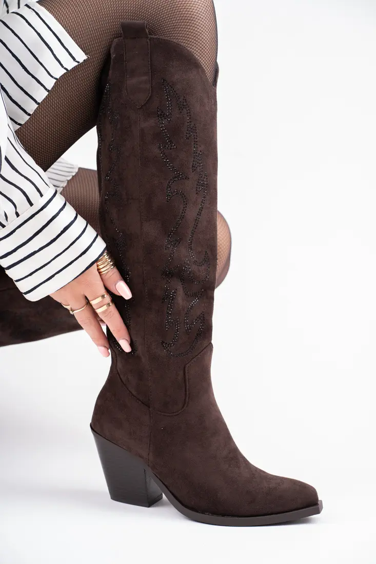Brązowe kozaki kowbojki zamszowe z cekinami