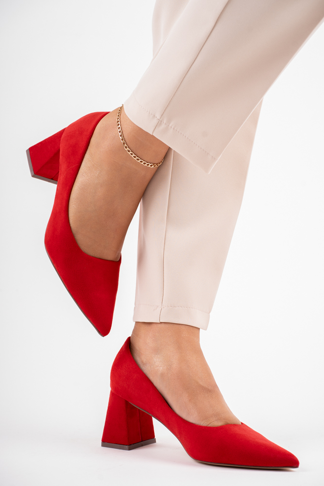 Czerwone zamszowe czółenka damskie na niskim szerokim obcasie