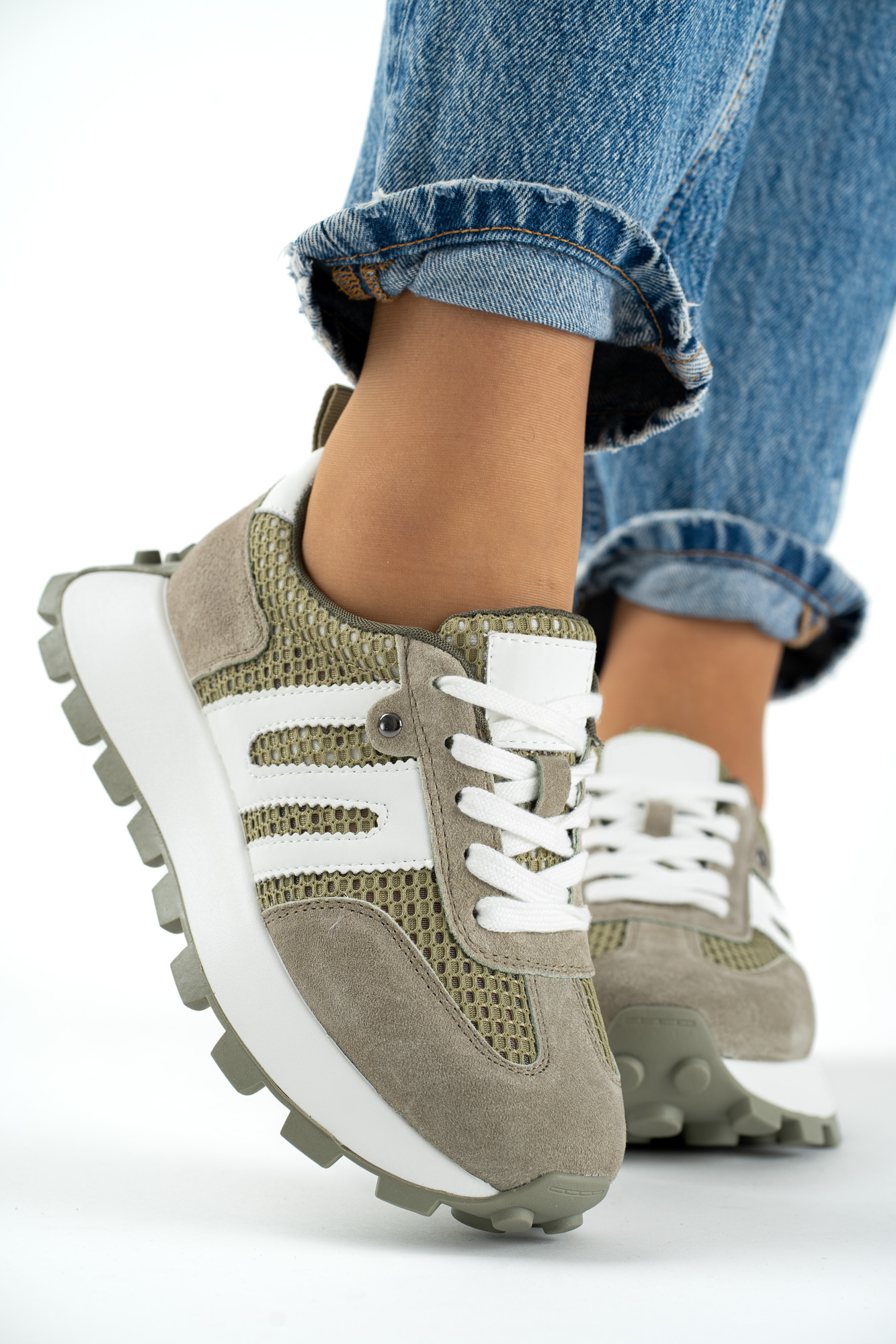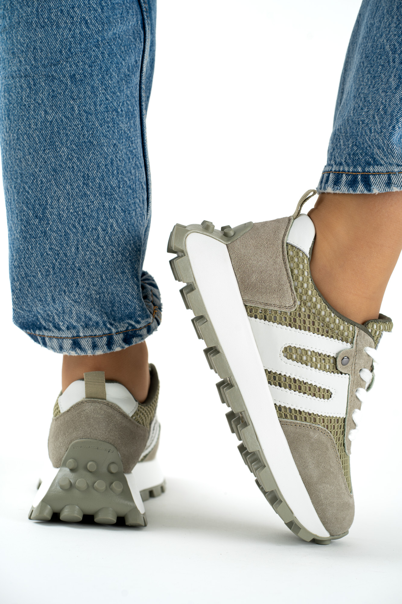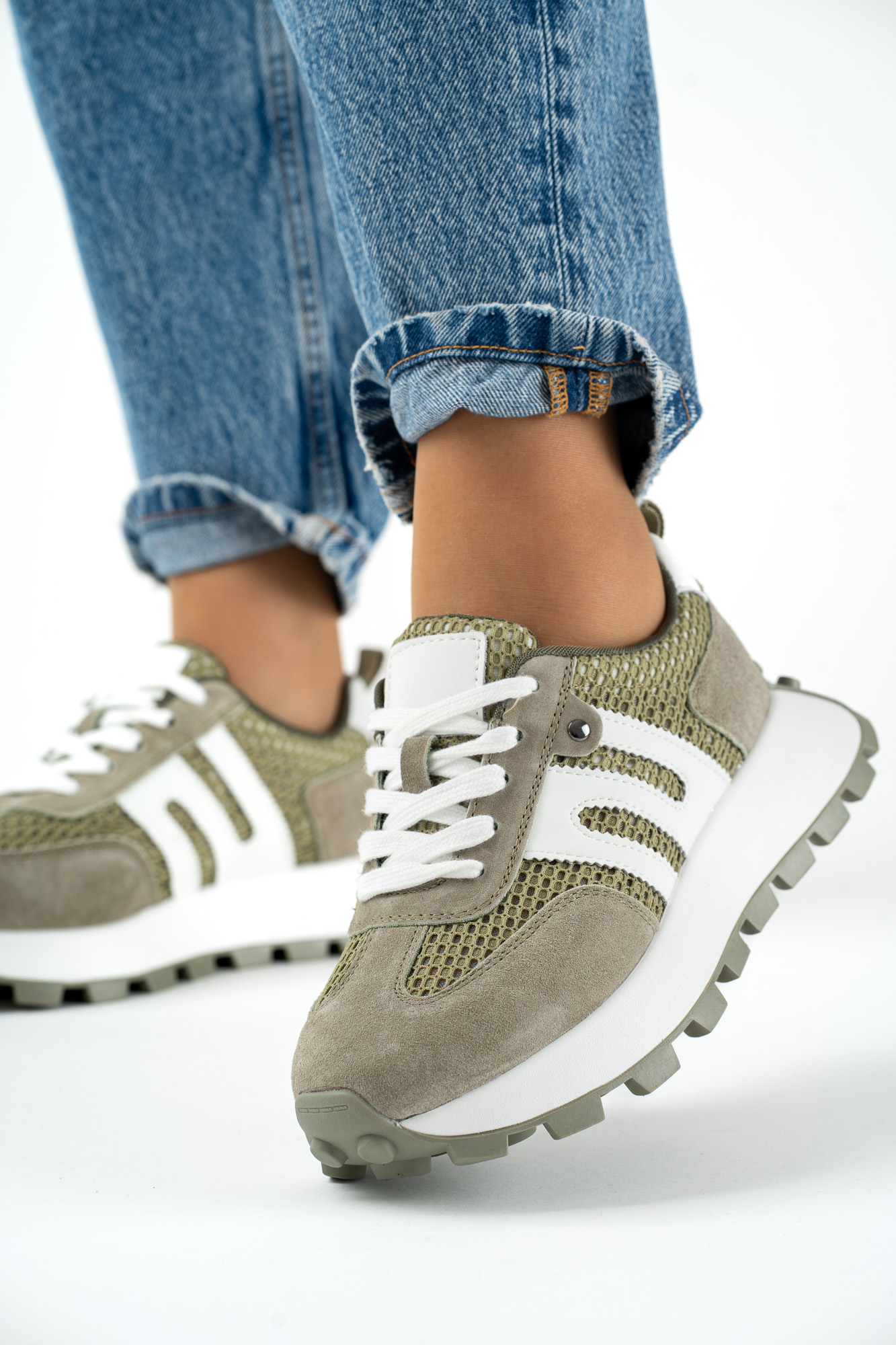 Sklep Oliwkowe sneakersy damskie ze skóry naturalnej – sportowe, wygodne modny design